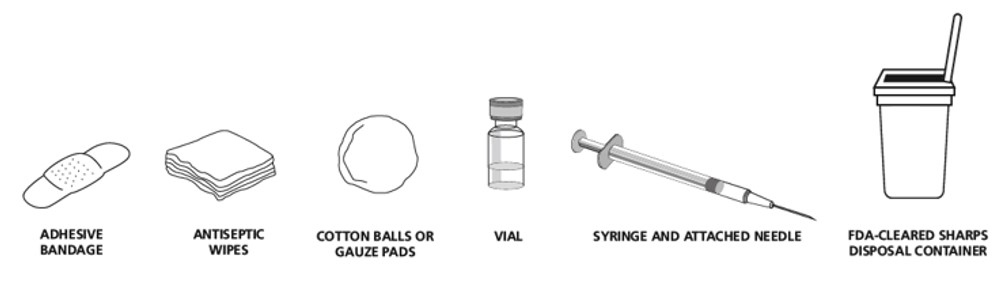 This is a list of medical supplies including adhesive antiseptic cotton balls or vial, syringe with an attached needle. These items are FDA-cleared sharps, along with bandage wipes, gauze pads, and a disposal container. These supplies are commonly used for wound care and medical procedures.*