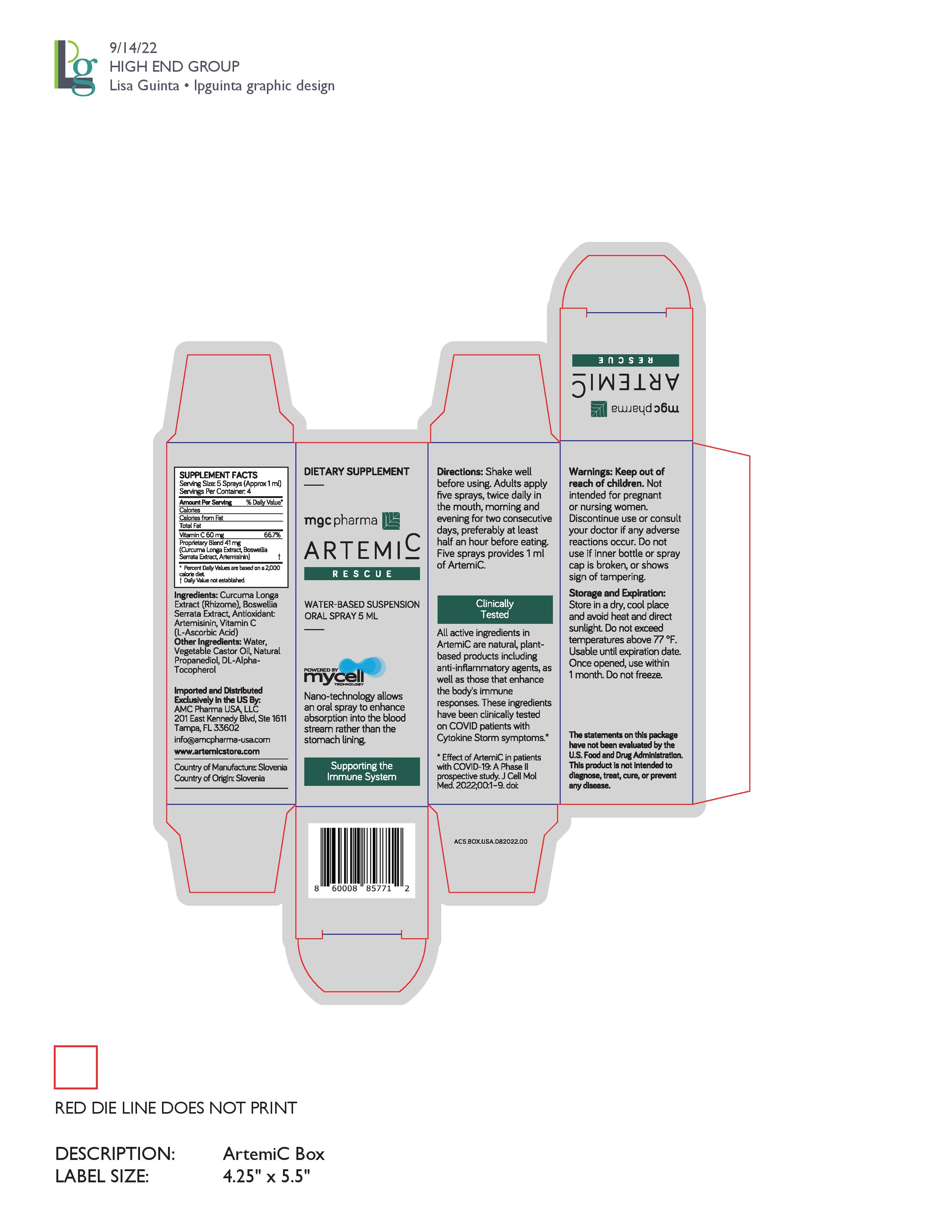 This is a description for a water-based suspension dietary supplement in oral spray form called Artemic. The product is manufactured by MGE Pharma and comes in a bottle size of 5ml. Users are advised not to exceed the daily recommended dose of 2x 5 sprays per day and the bottle should be shaken well before use. It is recommended to store the supplement below 77°F and it can be used until the expiration date mentioned. The distributor is AMC Pharma USA, LLC and they can be contacted at info@amcpharma-usacom. Unfortunately, the batch/lot number and expiration date are not available in the obtained text.*