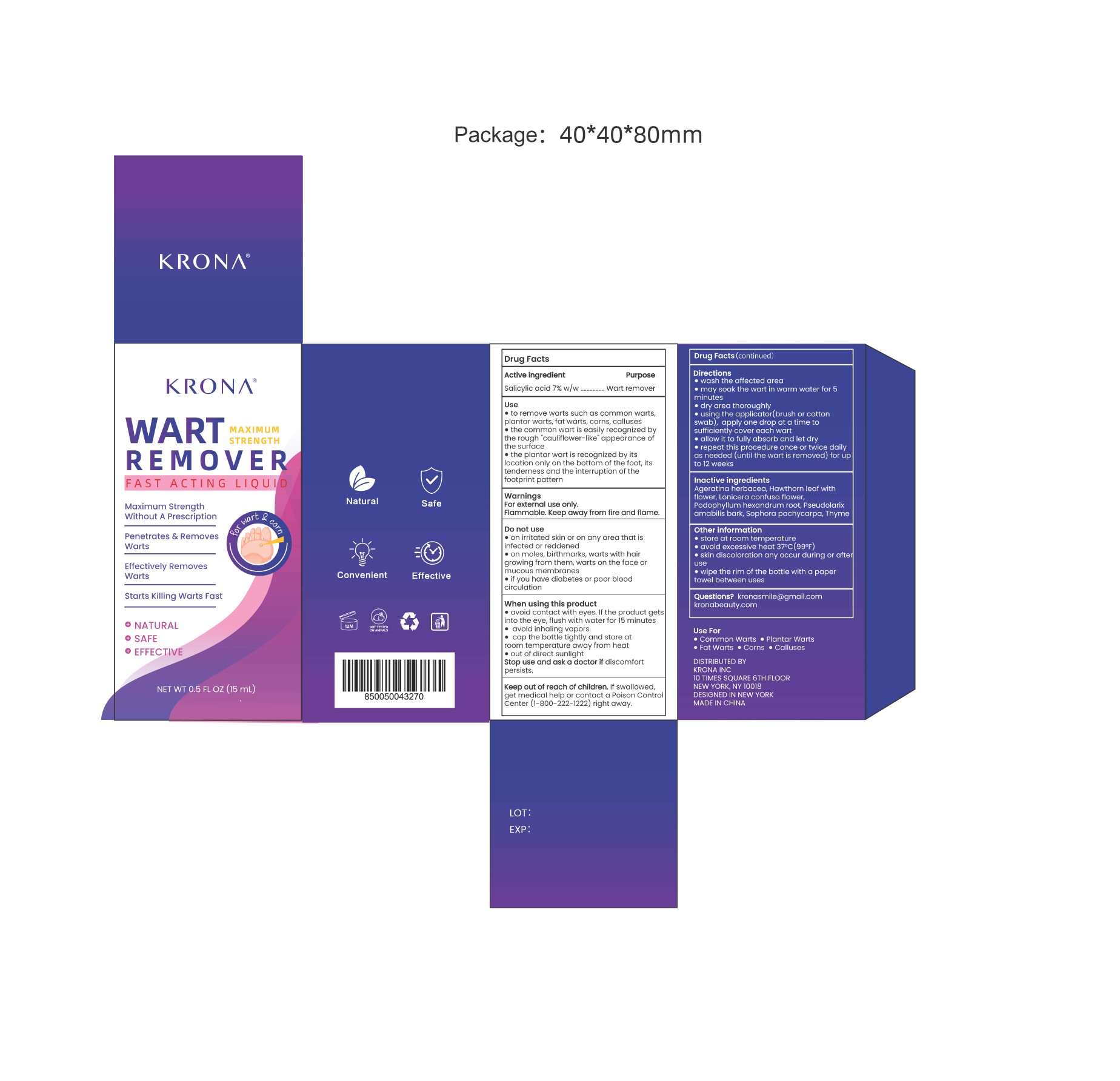 KRONA WART REMOVER is a fast-acting liquid solution with maximum strength that penetrates and removes warts effectively and without a prescription. It is a natural, safe and effective wart remover that starts killing warts fast. The package of KRONA WART REMOVER is of 40*40*80mm and the net weight of this remover is 0.5 oz (15 mL). The active ingredient of KRONA WART REMOVER is Salicylic acid. It is not recommended to use this remover on irritated skin, infected or reddened areas, moles, birthmarks, warts with hair growing from them, warts on the face or mucous membranes and by people who have diabetes or poor blood circulation. To use, simply wash the affected area, soak the wart in warm water for a few minutes, dry the area thoroughly, apply one drop at a time to gently cover each wart with the brush or cotton and let it absorb properly. The inactive ingredients of KRONA WART REMOVER are Ageratina herbacea, Hoyphyllum hexandrum ro, ‘amabilis bark, Sophora pachycarpa, and Thym. If discomfort persists, it is advisable to stop using this remedy and ask a doctor. It is highly flammable and should be kept away from fire and flame.*