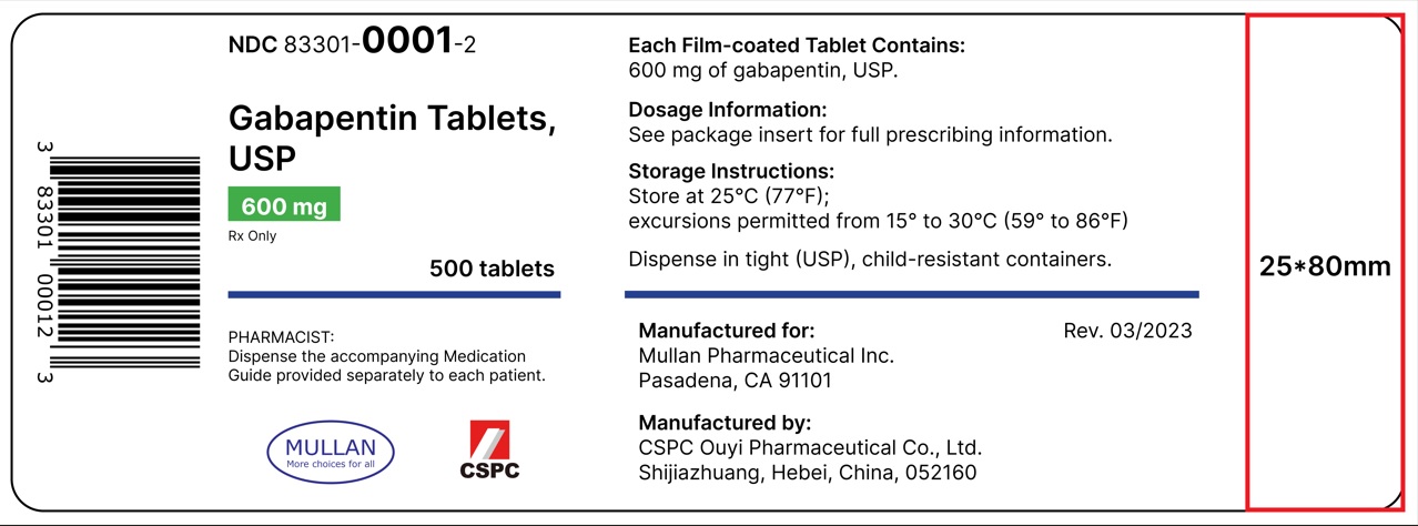 Gabapentin is a prescription drug provided in the form of film-coated tablets to patients. The dosage information and storage instructions can be found in the package insert given. Each tablet contains 600mg of gabapentin, USP, and is dispensed in tight (USP), child-resistant containers. The manufacturer is Mullan Pharmaceutical Inc., with Rev. 03/2023 as the latest revision. The tablets are manufactured by CSPC Ouyi Pharmaceutical Co., Ltd., Shijiazhuang, Hebei, China, 052160. A medication guide for each patient accompanies the tablets.*
