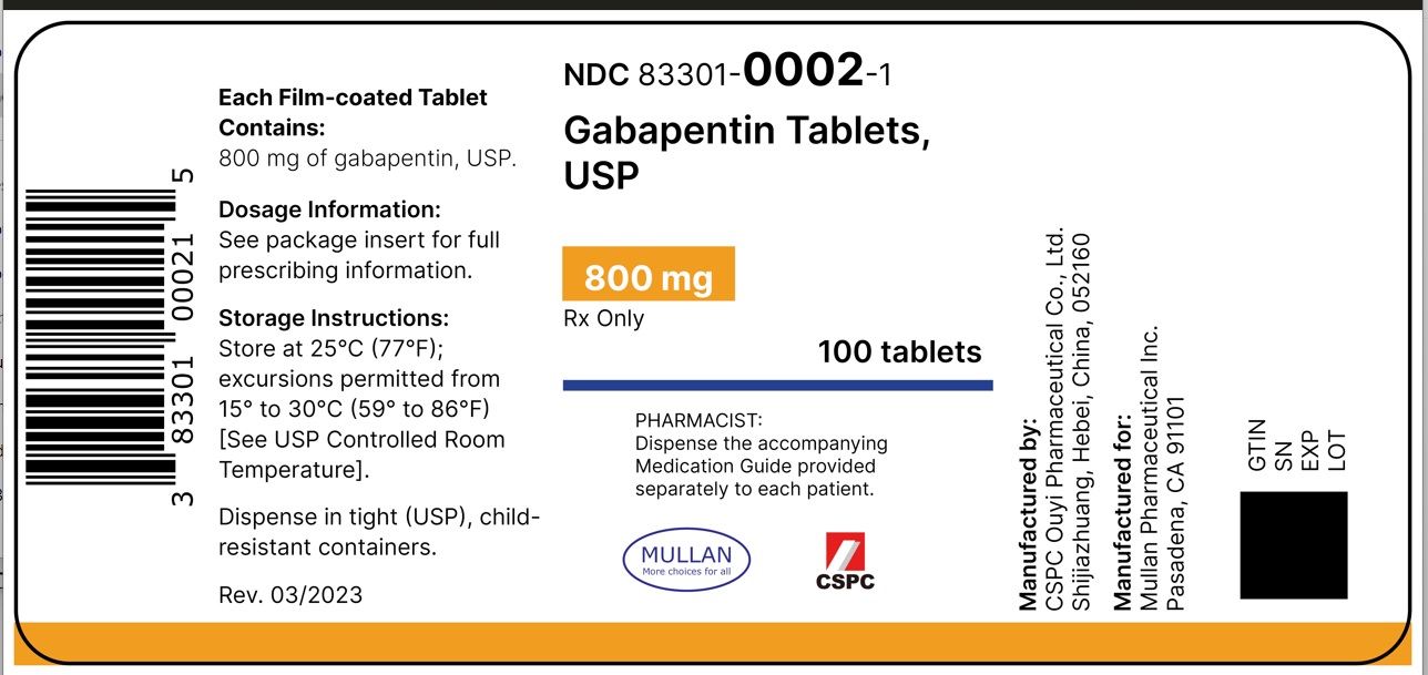 Gabapentin Tablets, USP is a medication available in film-coated tablets that contain 800 mg of gabapentin, USP, and is recommended to be stored at 25°C (77°F). It is to be dispensed in tight (USP), child-resistant containers, and 500 tablets are included per package. Each patient should be provided with a Medication Guide. Dosage information can be found in the package insert for full prescribing information. The manufacturer is Mullan Pharmaceutical Inc. and the medication is produced by CSPC Ouyi Pharmaceutical Co., Ltd. in Shijiazhuang, Hebei, China.*