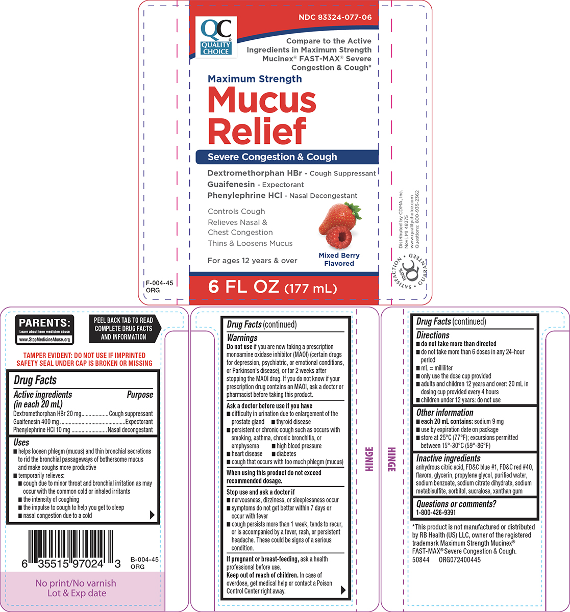 This text provides information about an over-the-counter drug with a National Drug Code (NDC) of 83324-077-06. The drug is a Maximum Strength Mucinex Fast-Max Severe Congestion & Cough formula, indicated for relief from severe congestion, cough, chest congestion, and mucus. The active ingredients include Dextromethorphan HBr (cough suppressant), Guaifenesin (expectorant), and Phenylephrine HCI (nasal decongestant). The drug is suitable for individuals aged 12 years and older and comes in a mixed berry flavor. It provides relief from symptoms such as cough, nasal congestion, and chest congestion. The text also includes important warnings, directions, inactive ingredients, and details about dosage and storage.*