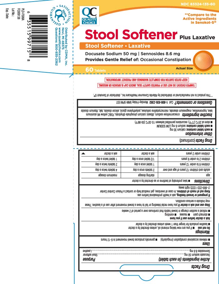 The following image provide visual information about the product associated with Senna S NDC 83324-135 by Quality Choice (chain Drug Marketing Association), such as packaging, labeling, and the appearance of the drug itself. This resource could be helpful for medical professionals, pharmacists, and patients seeking to verify medication information and ensure they have the correct product.