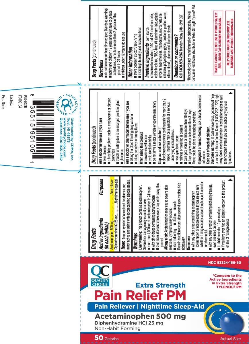The following image provide visual information about the product associated with Pain Reliever Pm NDC 83324-166 by Quality Choice (chain Drug Marketing Association), such as packaging, labeling, and the appearance of the drug itself. This resource could be helpful for medical professionals, pharmacists, and patients seeking to verify medication information and ensure they have the correct product.