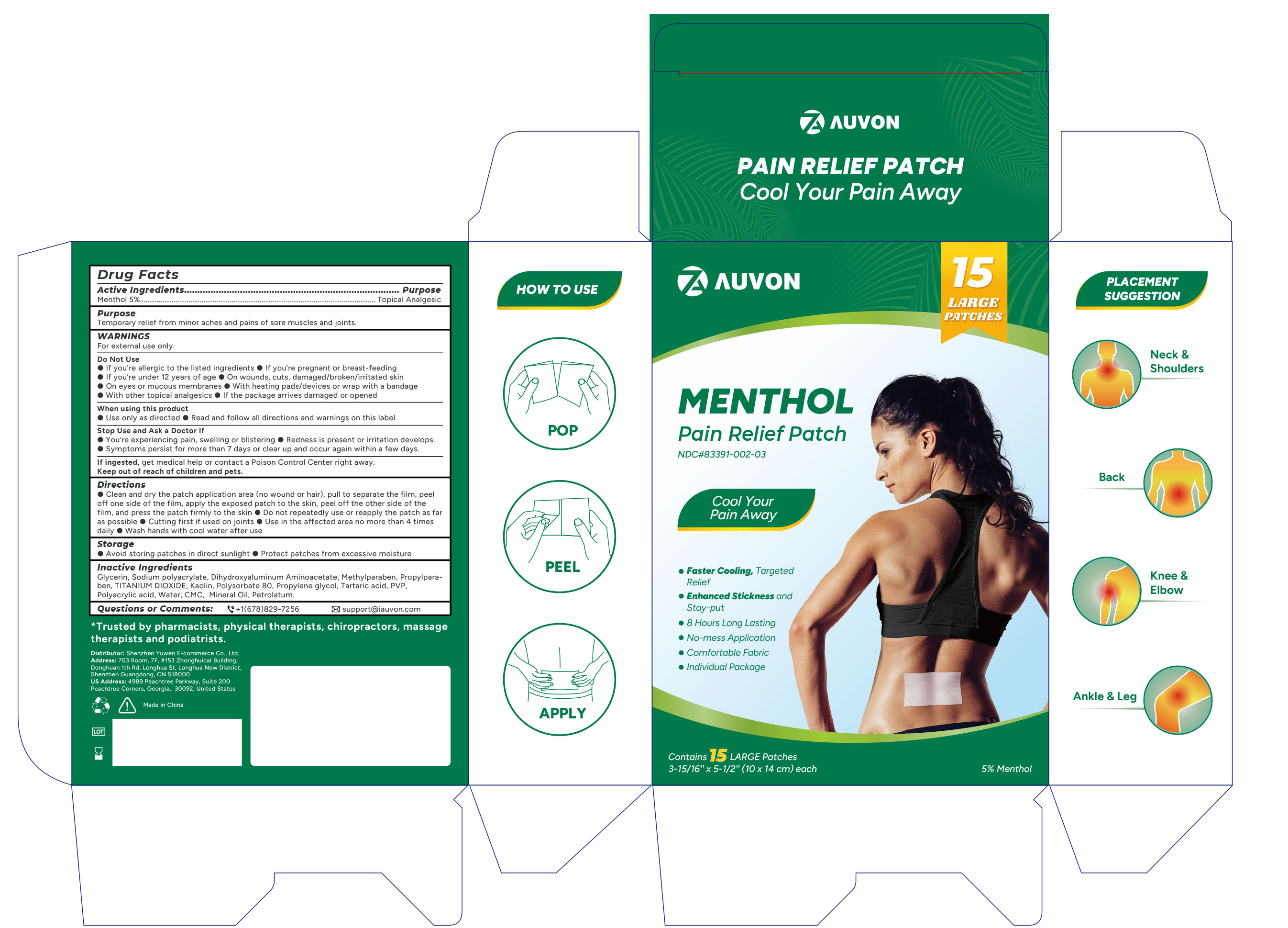 This text is a drug facts label for a pain relief patch that contains 5% Menthol. The patch is a topical analgesic and provides temporary relief from minor aches and pains of sore muscles and joints. It is for external use only and should not be used if allergic to the listed ingredients, pregnant, breastfeeding, under 12 years of age, on wounds or damaged/broken/irritated skin, on eyes or mucous membranes, with heating pads/devices or wrap with a bandage, with other topical analgesics, or if the package arrives damaged or opened. When using the product, it should be used only as directed and all directions and warnings on the label should be read and followed. Stop using and consult a doctor if pain, swelling, blistering, redness, or irritation occurs, or if symptoms persist for more than 7 days or clear up and occur again within a few days. In case of ingestion, medical help or contact with a Poison Control Center should be sought immediately. The patch should be kept out of reach of children and pets. Directions for use include cleaning and drying the patch application area, peeling off one side of the film to expose the patch, applying the patch firmly to the skin, peeling off the other side of the film, and pressing the patch firmly to the skin. The patch should not be repeatedly used or reapplied, but it can be cut if used on joints. It should be used in the affected area no more than 4 times daily, and hands should be washed with cool water after use. The patches should be stored away from direct sunlight and excessive moisture. The inactive ingredients include glycerin, sodium polyacrylate, dihydroxyaluminum aminoacetate, methylparaben, propylparaben, titanium dioxide, kaolin, polysorbate 80, propylene glycol, tartaric acid, PVP, polyacrylic acid, water, CMC, mineral oil, and petrolatum. The distributor of the product is Shenzhen Yuwen E-commerce Co, Ltd, located at the mentioned address in Shenzhen Guangdong, China, and there is also a US address provided in Peachtree Corners, Georgia. The product is described as trusted by pharmacists, physical therapists, chiropractors, massage therapists, and podiatrists. The pain relief patch is larger in size and is suggested for placement on the neck & shoulders, back, ankle & leg for targeted relief. The patch offers faster cooling, enhanced stickiness, and longer-lasting relief for up to 8 hours. It provides a no-mess application and is made of comfortable fabric. Each package contains 15 large patches that measure 3-15/16" x 5-1/2" (10 x 14 cm) each. The NDC number (National Drug Code) for the product is 83391-002-03. The text also provides a contact number for questions or comments and an email address for support.*