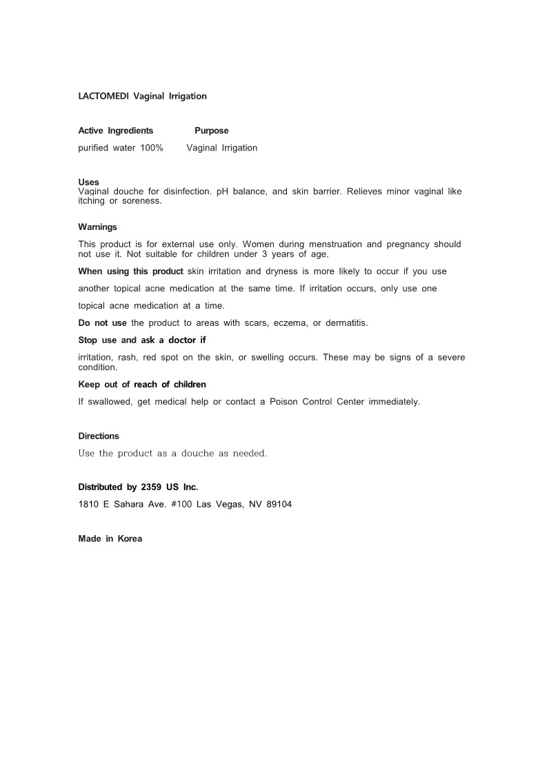 LACTOMEDI Vaginal Irrigation is a product for external use only, designed as a vaginal douche for disinfection, pH balance, and skin barrier. It is intended for relieving minor vaginal issues like itching or soreness. However, women during menstruation and pregnancy should not use it, and it is not suitable for children under 3 years of age. If skin irritation occurs, only one topical acne medication should be used at a time. Also, it should not be applied to areas with scars, eczema, or dermatitis. In case of severe skin conditions, please consult a doctor. The product is distributed by 2359 US Inc. in Las Vegas and made in Korea.*