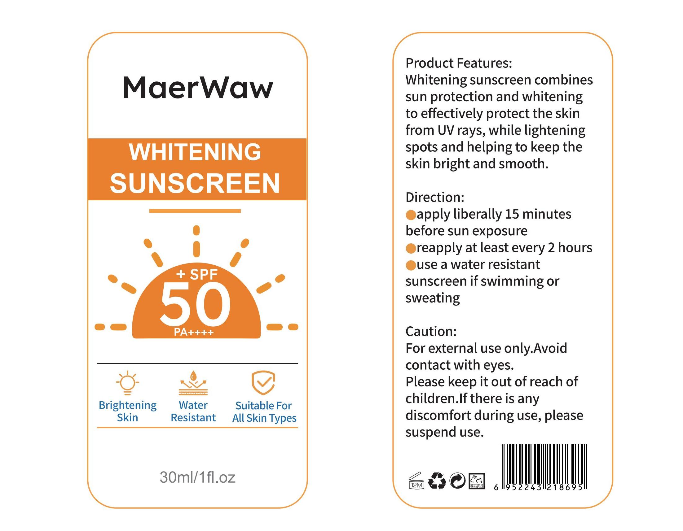 The following 2 images provide visual information about the product associated with Maerwaw Whitening Sunscreen NDC 83566-601 by Guangdong Aimu Biological Technology Co., Ltd, such as packaging, labeling, and the appearance of the drug itself. This resource could be helpful for medical professionals, pharmacists, and patients seeking to verify medication information and ensure they have the correct product.