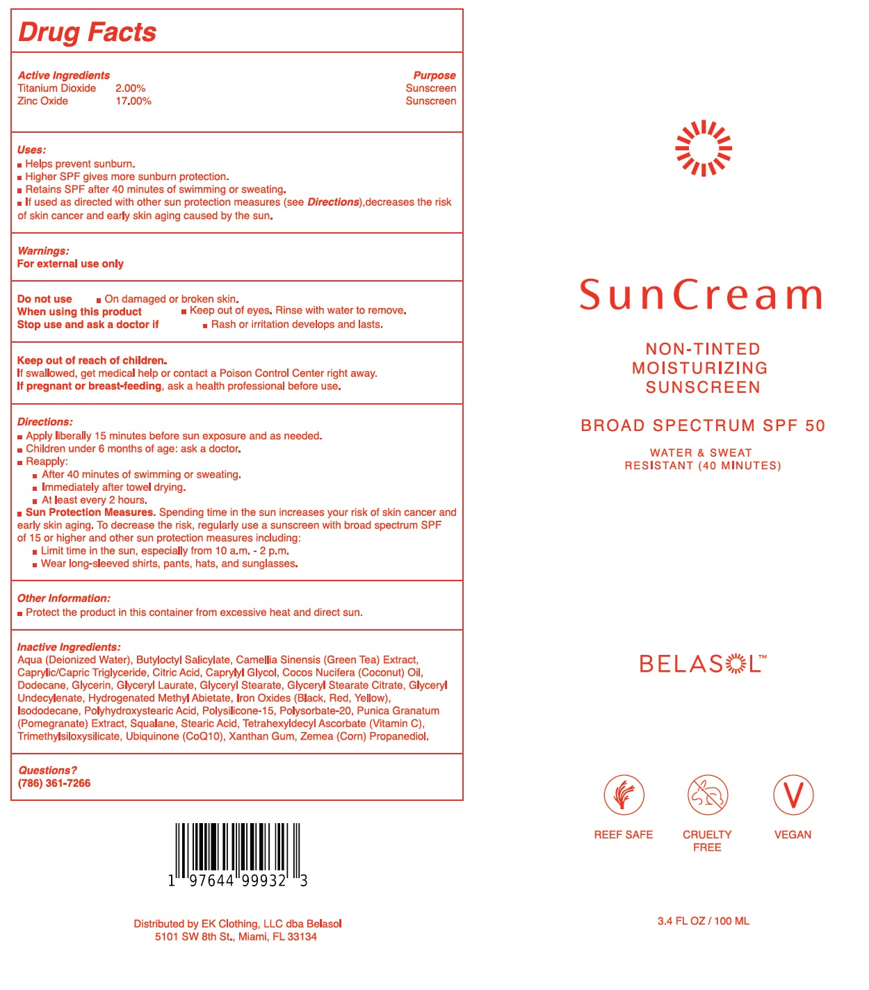 The following image provide visual information about the product associated with Belasol Suncream Non Tinted Moisturizing Sunscreen Spf 50 NDC 83789-573 by Ek Clothing Llc Dba Belasol, such as packaging, labeling, and the appearance of the drug itself. This resource could be helpful for medical professionals, pharmacists, and patients seeking to verify medication information and ensure they have the correct product.
