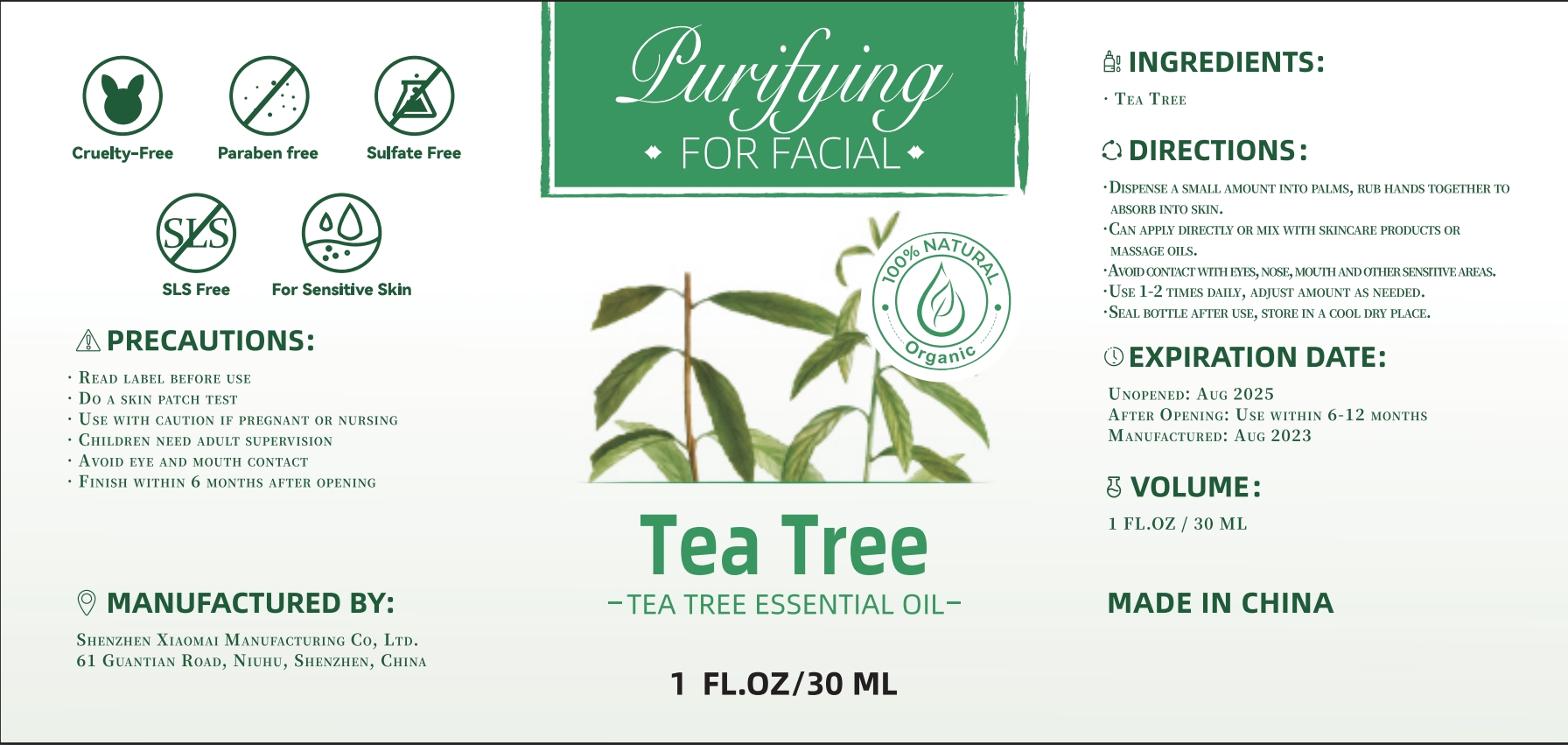This product is a cruelty-free, paraben-free, and sulfate-free Tea Tree Essential Oil. It is recommended for sensitive skin and comes in a 1 FL.OZ/30 ML bottle. The directions advise dispensing a small amount into palms, rubbing hands together to absorb into the skin. It can be applied directly or mixed with skincare products or massage oils. Precautions include avoiding eye and mouth contact, using with caution if pregnant or nursing, and keeping away from children. The product should be finished within 6 months after opening. It is manufactured in China and the expiration date for unopened products is August 2025.*