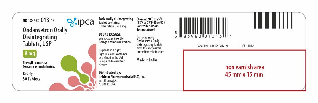 This is a description of Ondansetron orally disintegrating tablets, each containing 8mg. These tablets are suitable for phenylketonurics and should be stored at temperatures between 20°C to 25°C. The packaging includes 30 tablets and the product is distributed by Unichem Pharmaceuticals USA, Inc. The recommended dosage should be administered using acid-resistant dosing, and the tablets must be taken straight from the bottle immediately before use. Made in India, the tablets are for controlled room temperature use.*