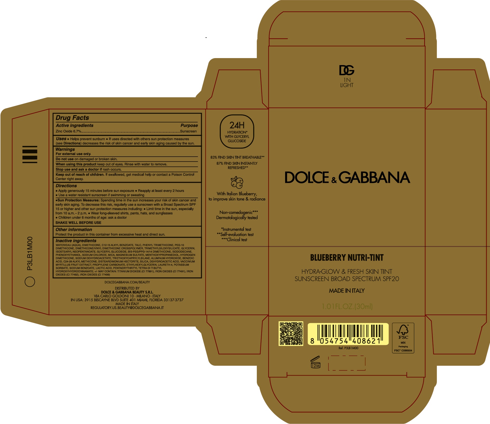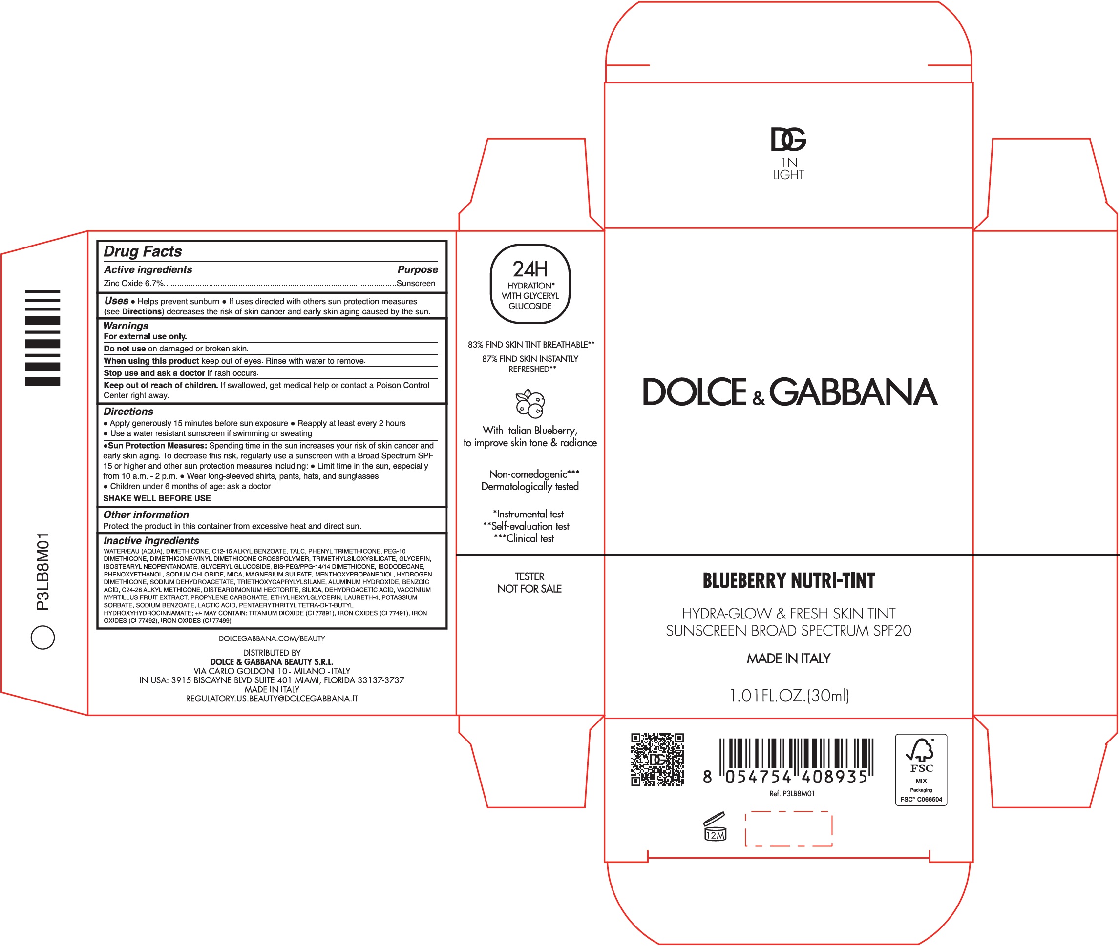 This is a drug facts label for a skincare product containing zinc oxide as an active ingredient for sun protection. The product is a sunscreen with SPF 20 called Blueberry Nutri-Tint Hydra-Glow & Fresh Skin Tint. It is made in Italy and distributed by Dolce & Gabbana Beauty. The sunscreen is designed for hydration and skin tone improvement, incorporating Italian Blueberry extract. The formula is non-comedogenic and dermatologically tested. Recommendations include applying generously before sun exposure, reapplying every 2 hours, and using water-resistant sunscreen if swimming or sweating. It also provides information on sun protection measures and the risks of sun exposure. Additionally, the product has instructions and warnings such as avoiding contact with eyes and consulting a doctor in case of a rash.*