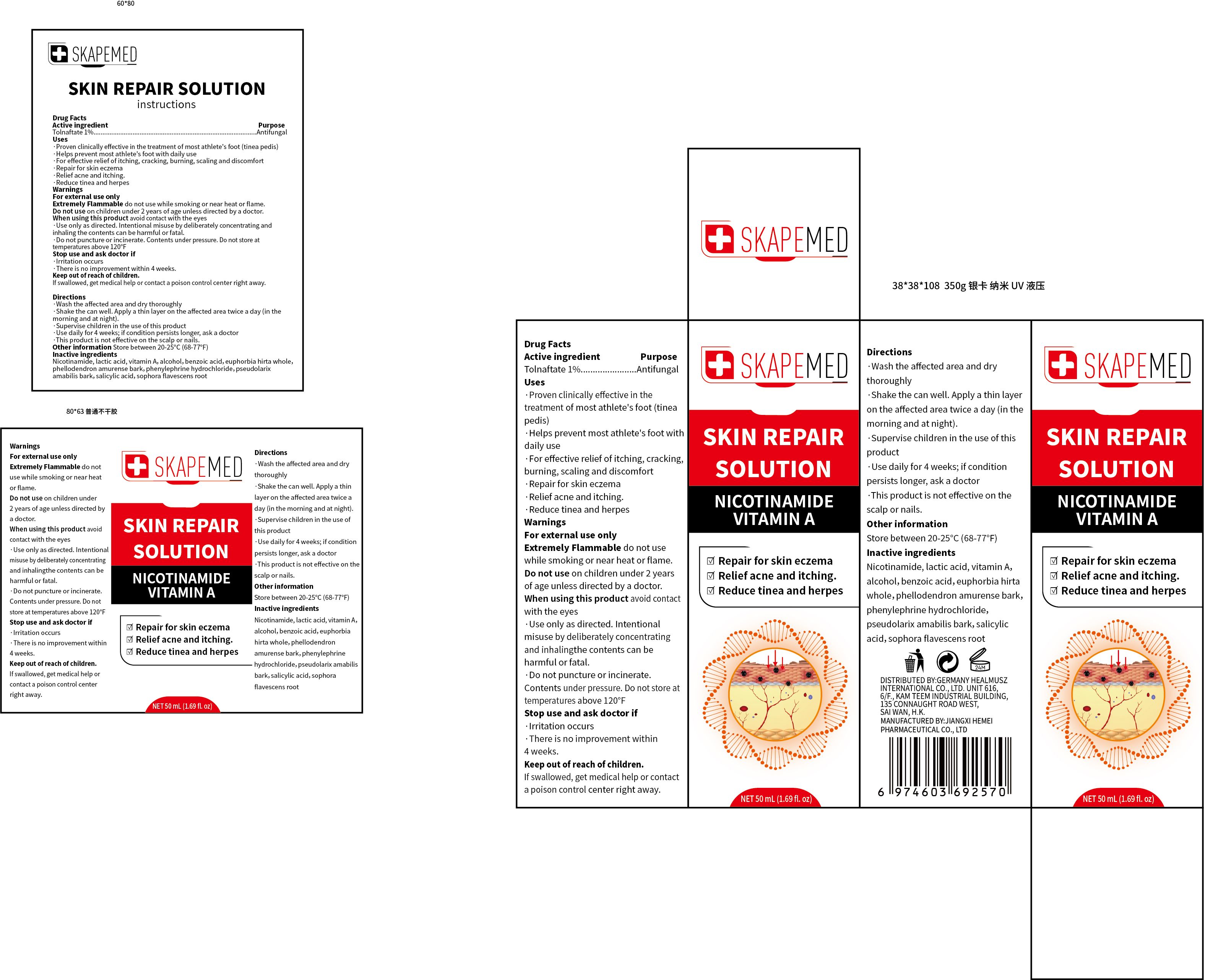 This text appears to be the product information of "Skapemed Skin Repair Solution". The solution contains Tolnaftate 1% as an active ingredient and is used for the treatment of athlete's foot, eczema, acne, itching, tinea, and herpes. The product is clinically proven effective and should be used twice daily by washing the affected area and applying a thin layer. It is important to keep the product away from children and avoid contact with the eyes. The text also provides information about storage conditions, warnings, directions for use, and inactive ingredients.*