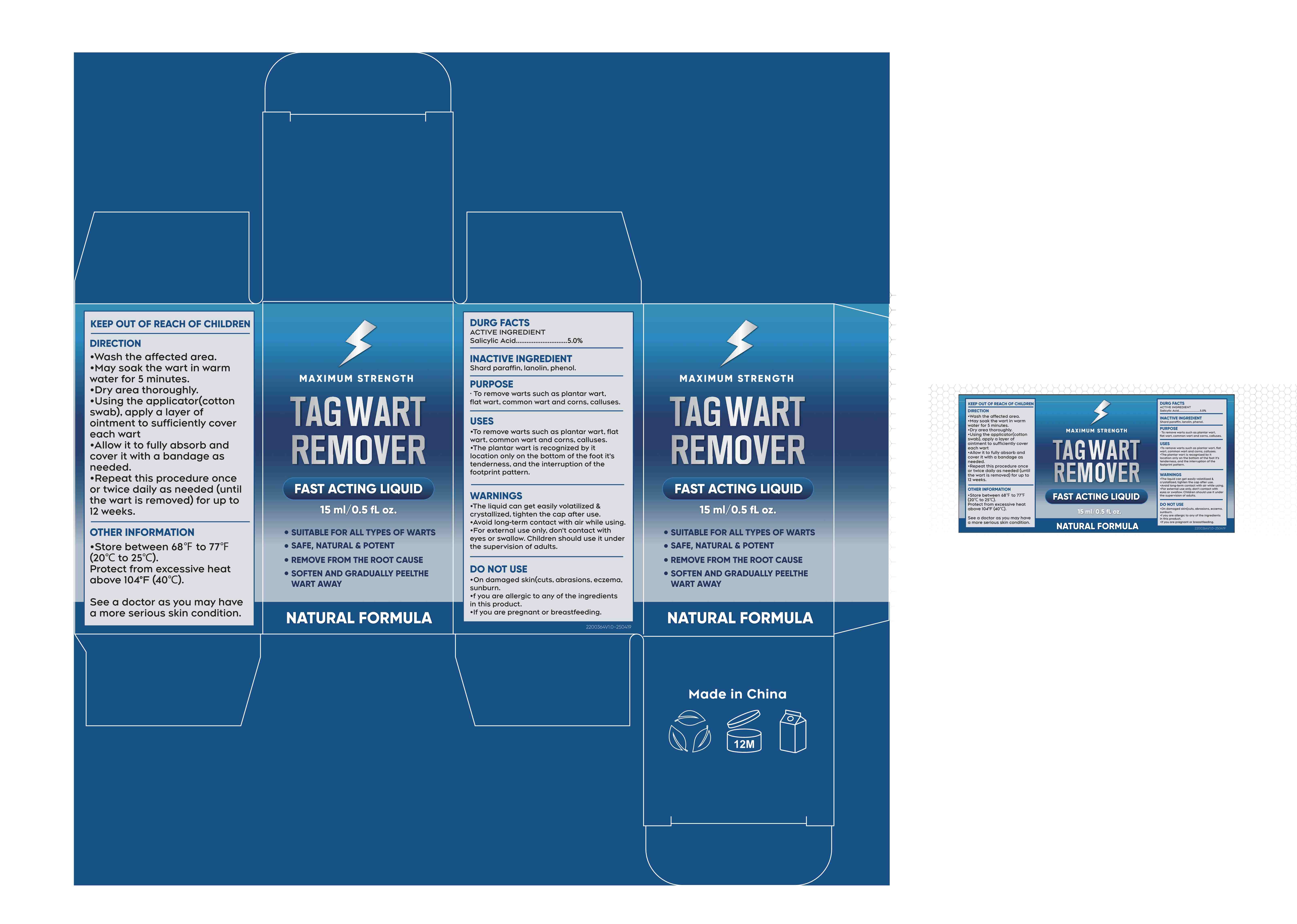 This is a detailed set of instructions for using the Tagwart Remover. The product contains salicylic acid as an active ingredient and is designed to remove warts like plantar warts, flat warts, common warts, corns, and calluses. It provides directions for application, storage conditions, product warnings, and information on ingredients. The instructions suggest soaking the wart, applying the ointment with an applicator, and covering it with a bandage. Users are advised on how often to apply the product until the wart is removed. The text also mentions precautions such as protecting from excessive heat and seeking medical advice for serious skin conditions.*