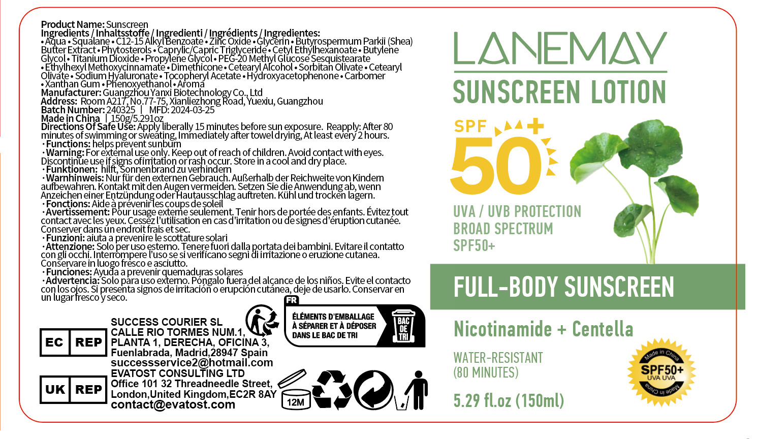 This text is a detailed description of a sunscreen product named "LANEMAY SUNSCREEN LOTION" with UVA/UVB protection, broad-spectrum SPF50+, full-body coverage, water-resistant for 80 minutes, and containing Nicotinamide + Centella. The manufacturer is Guangzhou Yanxi Biotechnology Co., Ltd, based in China. The product comes in a size of 5.29 fl.oz (150ml). The directions for safe use include applying liberally 15 minutes before sun exposure and reapplying every 2 hours. The text also provides warnings and instructions in multiple languages such as German, French, Italian, and Spanish regarding external use, avoiding contact with eyes, and discontinuing use in case of irritation.*