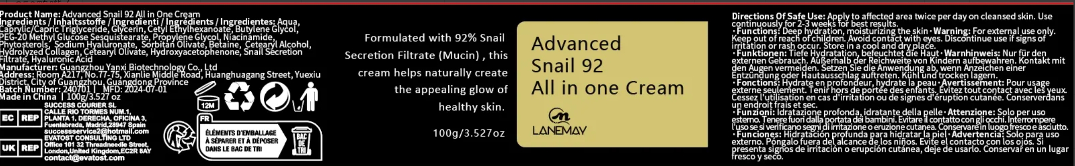 Product Name: Mizon Snail 92 All in One Cream Functions: Hydrates and moisturizes the skin Ingredients: Contains 92% Snail Secretion Filtrate (Mucin) Usage: Apply twice per day on cleansed skin Warning: For external use only, keep out of reach of children, avoid contact with eyes Batch Number: 738708 Net Weight: 100g/3.527 oz Made in China Address: CALLE RIO TORMES NUM.1, PLANTA 1, DERECHA, OFICINA 3, Fuenlabrada, MADRID This Mizon Snail 92 Cream helps hydrate and create healthy skin, formulated with 92% Snail Secretion Filtrate for moisturizing benefits. Can be used twice a day after cleansing. Follow usage instructions and warnings for best results.*