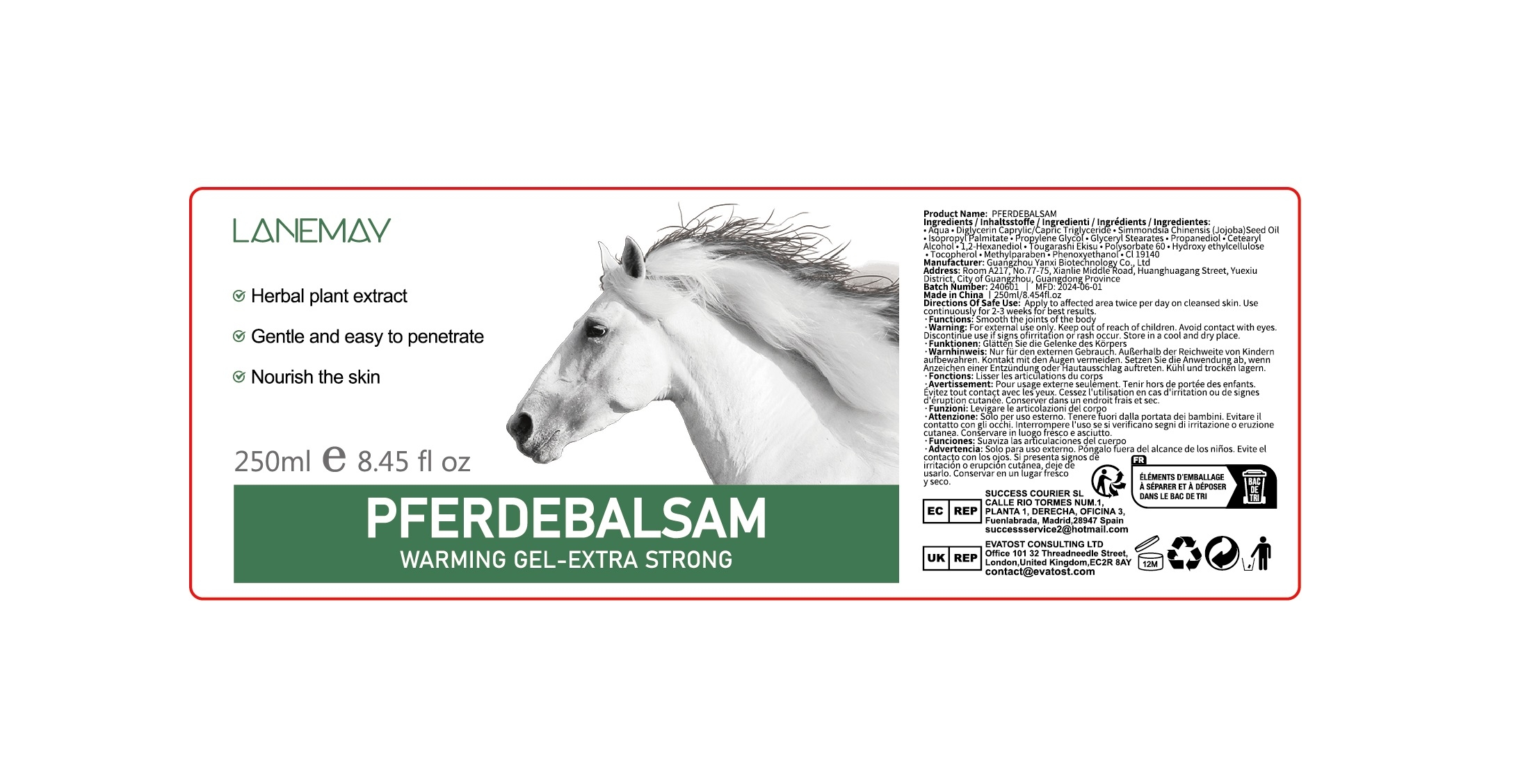 LANEMAY Herbal Plant Extract is a gentle and easily penetrating skin nourishing product. It comes in a 250ml/8.45 fl oz container. Directions for safe use advise applying to the affected area twice a day on cleansed skin for 2-3 weeks for optimal results. The warming gel product, PFERDEBALSAM, manufactured by Guangzhou Yanxi Biotechnology Co. Ltd, contains various ingredients and is made in China. It is advised for external use only and to avoid contact with eyes. For any issues, discontinue use and store in a cool, dry place. Additional contact details for SUCCESS COURIER SL in Spain and EVATOST CONSULTING LTD in the United Kingdom are also provided.*