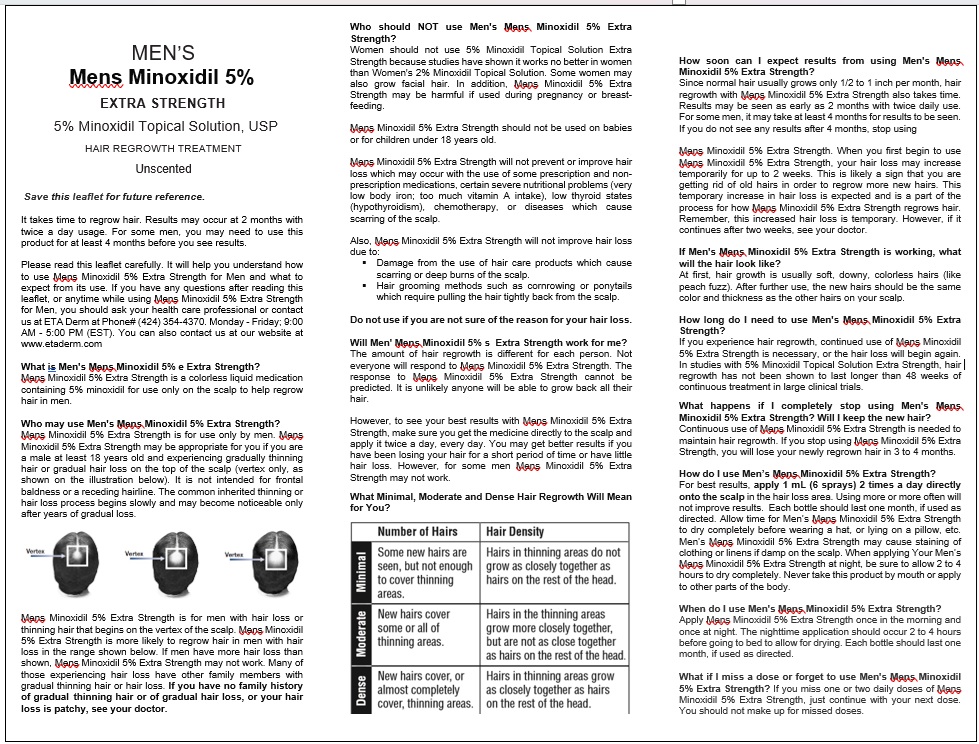 This is a detailed description of Men's Minoxidil 5% Extra Strength topical solution for hair regrowth treatment in men. It explains who can use the product, the expected results, how to use it, and potential side effects. The text includes information about the timeframe to see results, how to apply the solution, the possibilities of regrowth in thinning areas, and the importance of continuous use for maintaining regrown hair. It also mentions scenarios where the product may not work, such as on women, children, or certain types of hair loss. The text provides guidance on the frequency of use, potential temporary increase in hair loss at the beginning of treatment, and what the new hair may look like. It also advises on what to do if a dose is missed and emphasizes the need to seek medical advice in certain situations.*