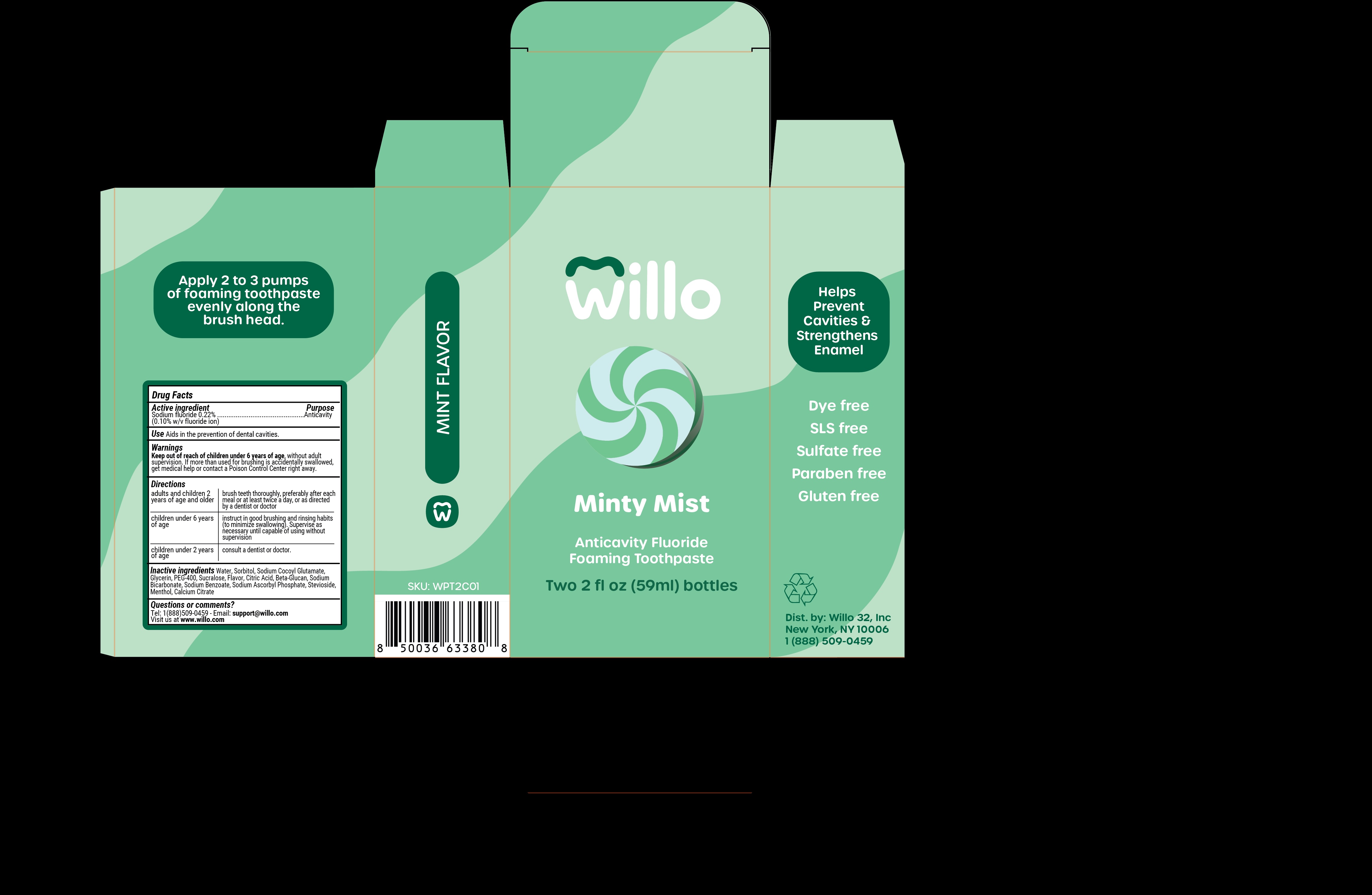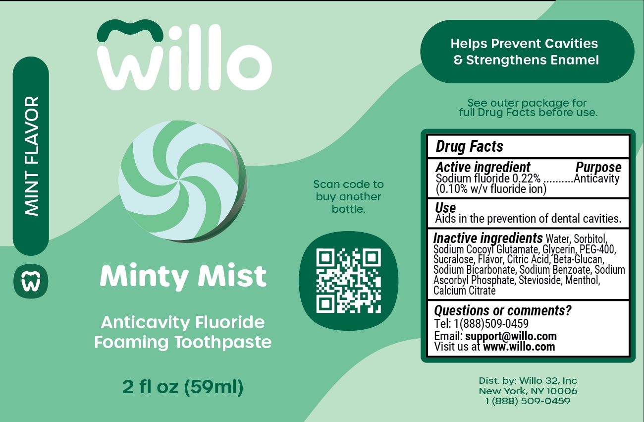 This is a description of a foaming toothpaste containing sodium fluoride as an active ingredient for cavity prevention. The toothpaste is recommended for adults and children over 2 years old to be used after meals or at least twice a day. The product also contains various inactive ingredients such as water, sorbitol, and menthol. It is advised to keep the toothpaste out of reach of children under 6 years old and contact a Poison Control Center if accidentally swallowed. For more information, contact Willo at the provided email and phone number or visit their website.*