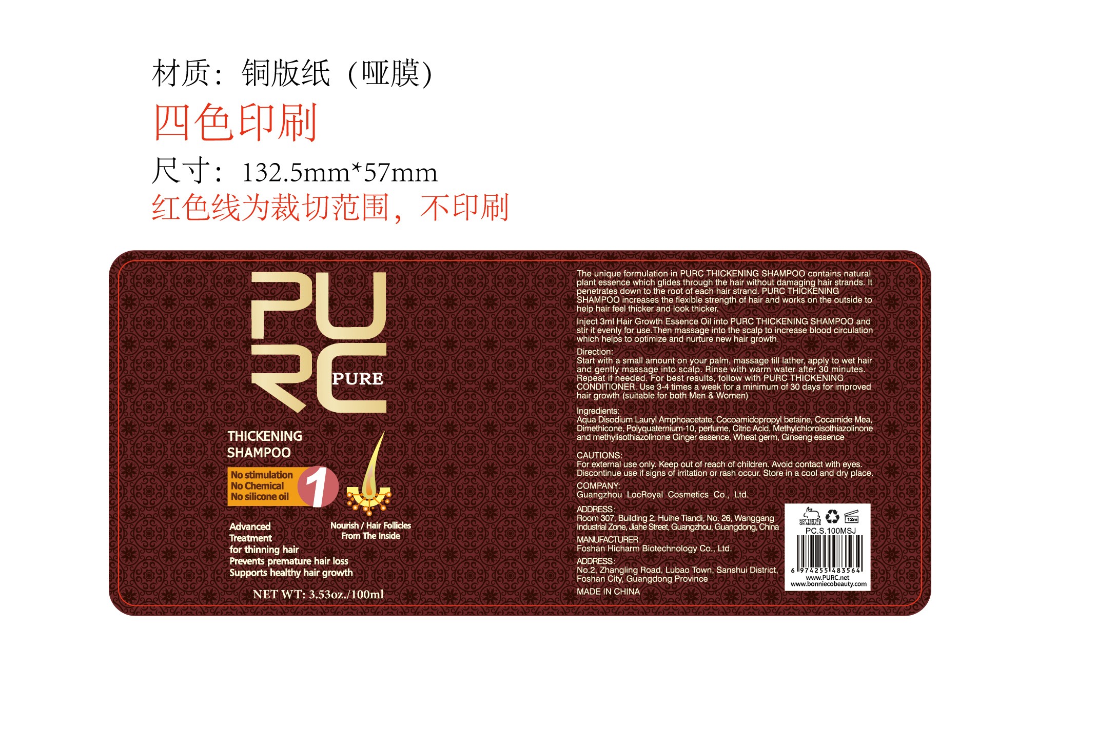 This is a description of a hair care product, PURC Thickening Shampoo, which is designed to promote hair growth and prevent premature hair loss. The shampoo contains natural plant essence and is formulated to strengthen hair strands from the inside out, making hair feel thicker and look healthier. Additionally, the product can be combined with a Hair Growth Essence Oil for optimal results. The directions for use include massaging the shampoo into wet hair and scalp, then rinsing after 30 minutes. It is recommended to follow with a thickening conditioner for best results. The product is suitable for both men and women and should be used 3-4 times a week for at least 30 days to see improved hair growth. The shampoo is manufactured by Guangzhou LocRoyal Cosmetics Co., Ltd in China.*