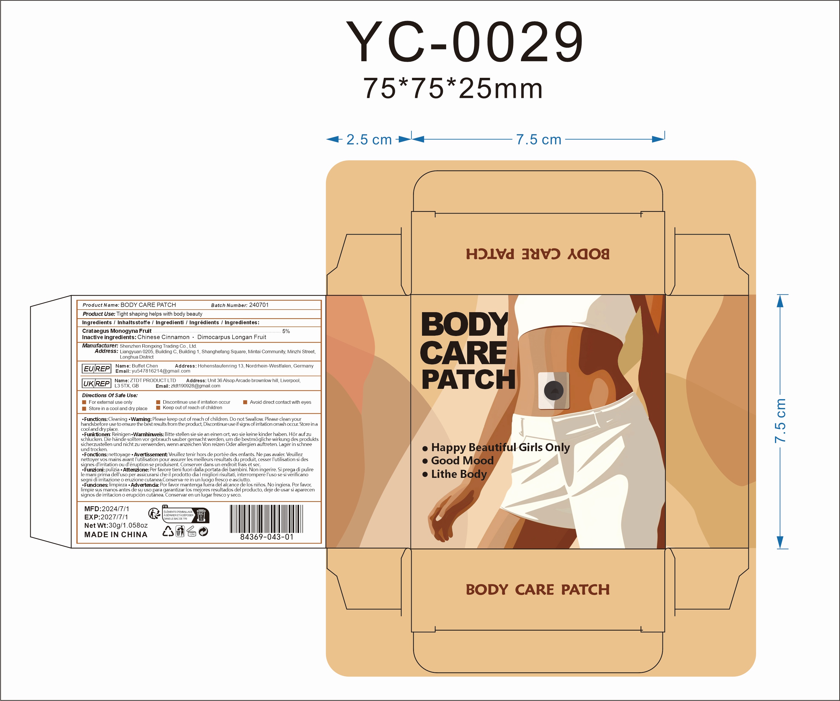 This text provides detailed information about a product called "BODY CARE PATCH" manufactured by Shenzhen Rongxing Trading Co., Ltd in China. The patch is designed for tight shaping to enhance body beauty and contains Crataegus Monogyna Fruit as the active ingredient. The product is only for external use, and precautions such as avoiding contact with eyes and keeping out of reach of children are mentioned. The manufacturing and distribution details, including addresses in China, Germany, and the UK, are also provided. Customer directions for safe use are outlined, along with multilingual instructions warning against ingestion and emphasizing the importance of clean hands for optimal results. The batch number, expiry date, and net weight of the product are clearly indicated.*
