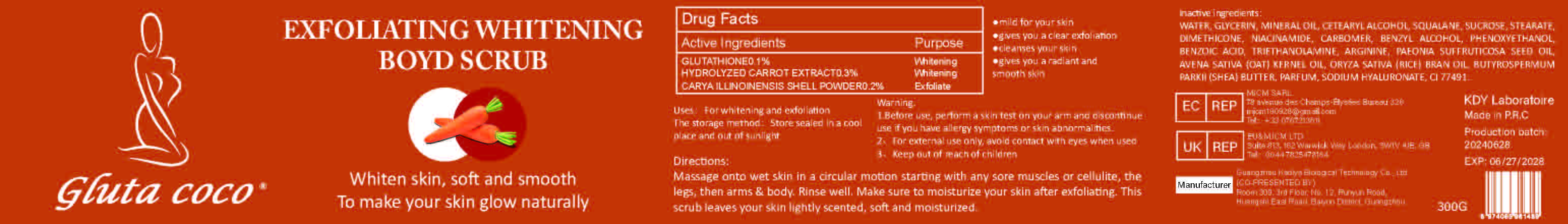 This product is Gluta Coco Exfoliating Whitening Body Scrub which is designed to whiten the skin while making it soft and smooth, giving a natural glow. The scrub contains active ingredients like Glutathione for whitening, Hydrolyzed Carrot Extract for smooth skin, and Carya Illinoinesis Shell Powder for exfoliation. The instructions recommend massaging onto wet skin in circular motions, starting with sore muscles or cellulite, then rinsing well and moisturizing afterwards. The scrub leaves the skin lightly scented and moisturized. The product also provides details on warning, uses, storage method, and inactive ingredients.*