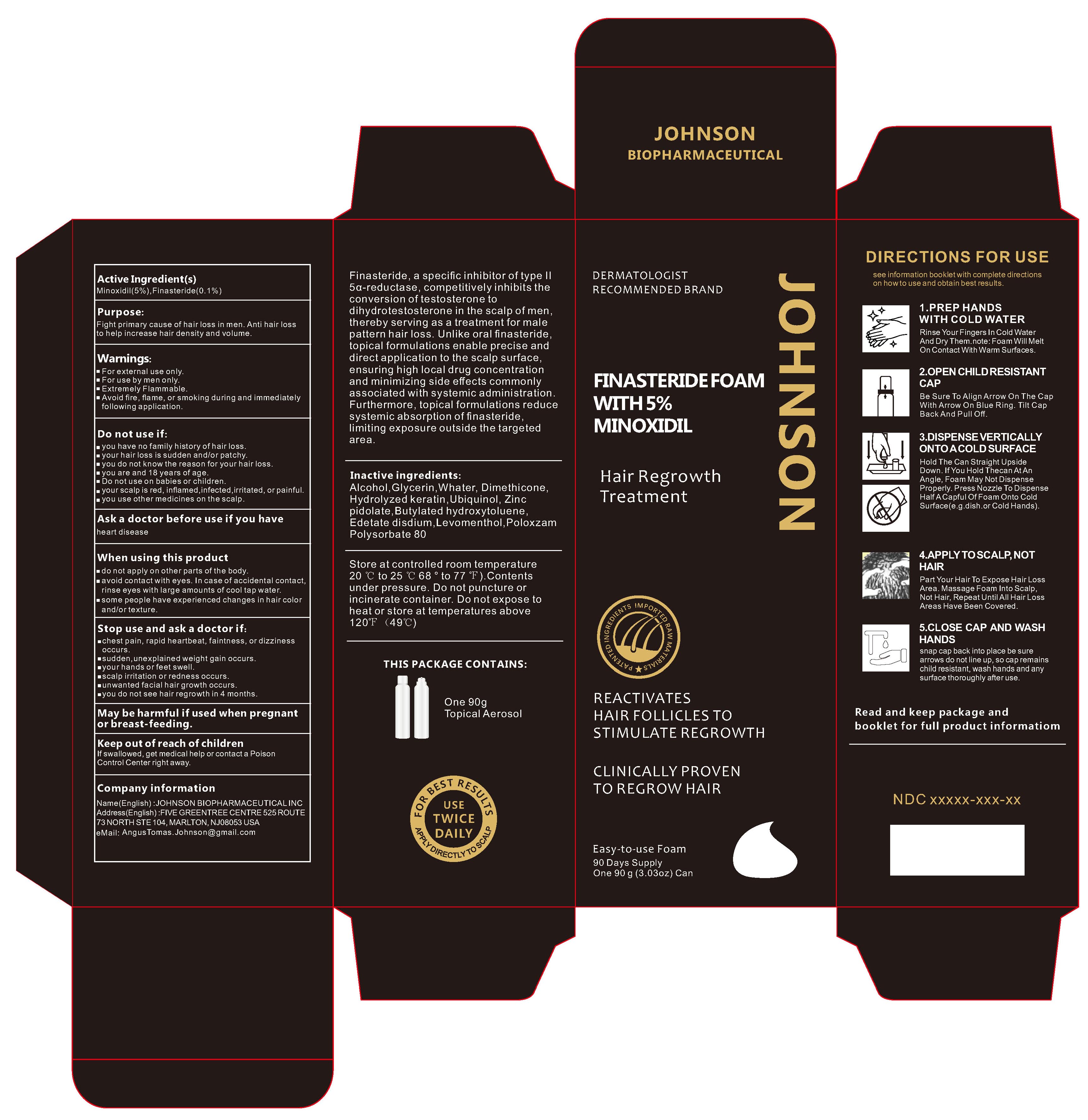This text contains information about a hair loss treatment product containing Minoxidil and Finasteride. It provides details about the purpose of the product, directions for use, warnings, inactive ingredients, and when to consult a doctor. The product is indicated to fight the primary cause of hair loss in men, increase hair density and volume, and reactivate hair follicles for regrowth. It is essential to follow the recommended directions for usage and precautions, especially avoiding contact with eyes and seeking medical advice in case of specific symptoms. The product comes in a foam form and is recommended for external use by men only.*