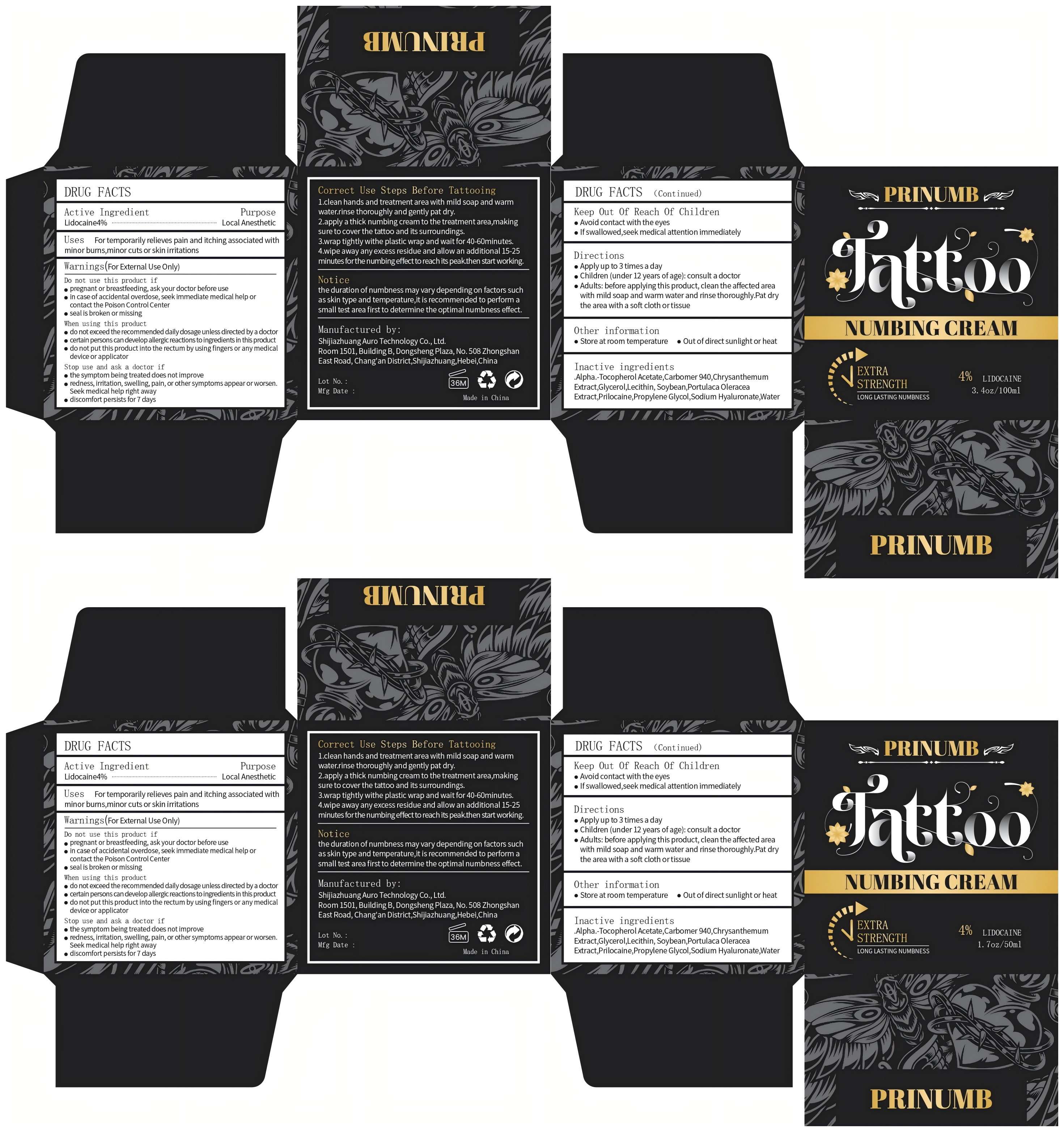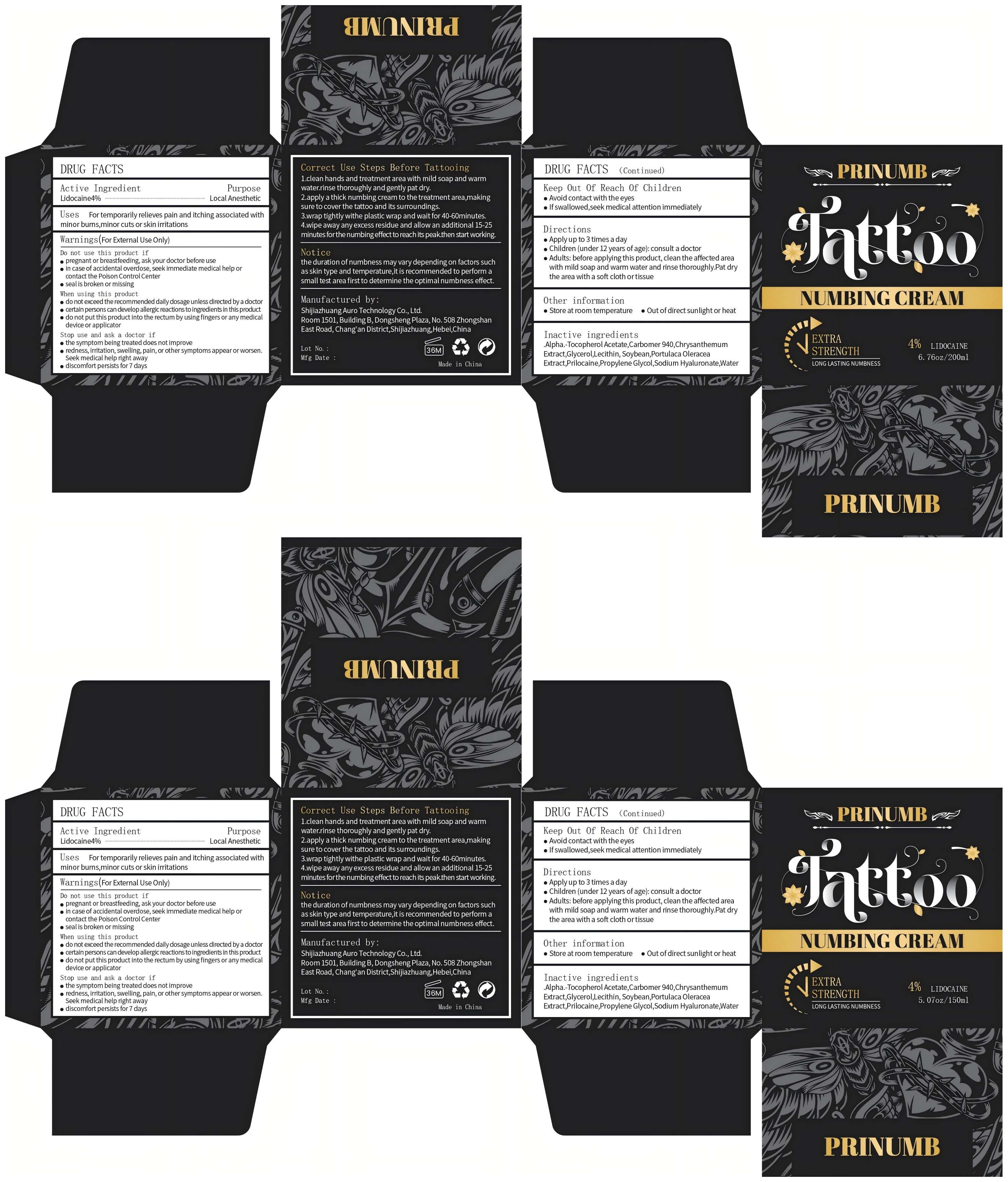 The following 4 images provide visual information about the product associated with Prinumb Tattoo Numbing Cream NDC 84555-002 by Shijiazhuang Auro Technology Co., Ltd., such as packaging, labeling, and the appearance of the drug itself. This resource could be helpful for medical professionals, pharmacists, and patients seeking to verify medication information and ensure they have the correct product.