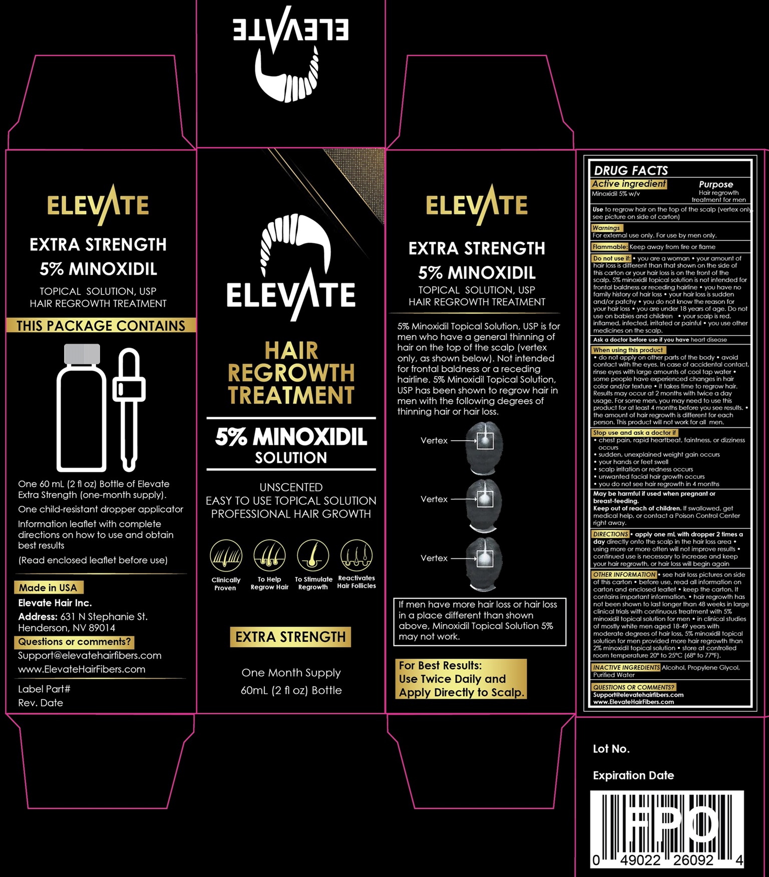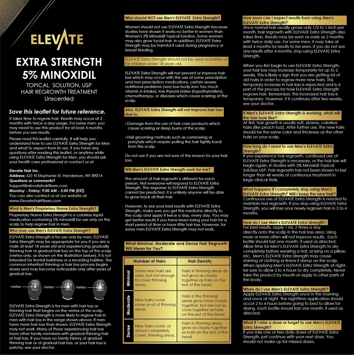 This text describes a hair regrowth treatment called "Elevate Extra Strength" in a 60 mL bottle with a child-resistant dropper applicator. It contains 5% Minoxidil in a topical solution, intended for men with thinning hair on the vertex of the scalp. The package includes directions for use, warnings about potential side effects, and information about the product's effectiveness based on clinical studies. The text emphasizes the importance of consistent use for optimal results and provides contact information for questions or comments.*