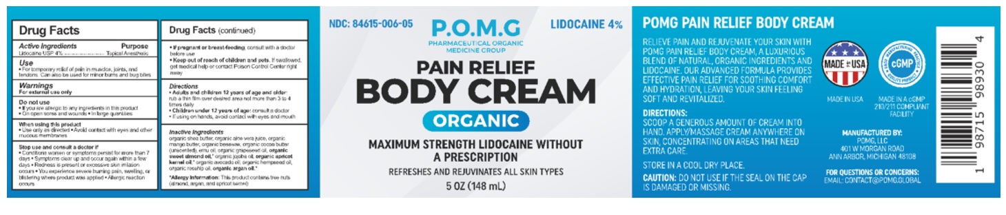This is a description for a pain relief body cream called POMG Pain Relief Body Cream. The cream is formulated with maximum strength lidocaine and can be used without a prescription. It is designed to refresh and rejuvenate all skin types.*