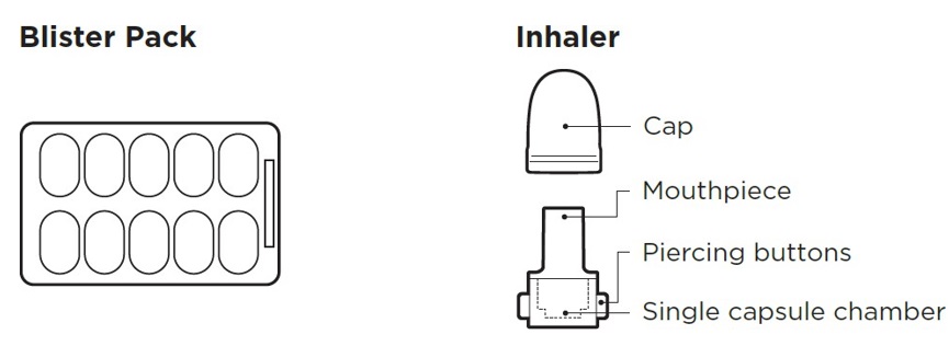 This text describes a blister pack inhaler with a single capsule chamber and piercing buttons.*