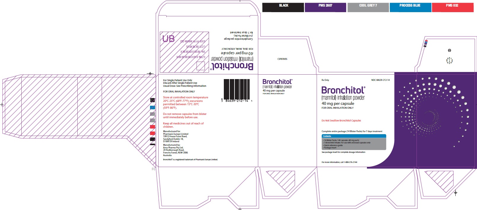 This text contains information about the Bronchitol Tolerance Test, which is a test for identifying bronchial hyperresponsiveness to mannitol. The test involves inhalation powder capsules containing 40mg of mannitol that are to be used for oral inhalation only. It is crucial to complete the Tolerance Test before prescribing Bronchitol. Detailed procedure instructions for the Tolerance Test should be read carefully. The text also includes NDC number 84639-212-04 and emphasizes not to swallow the Bronchitol capsules.*