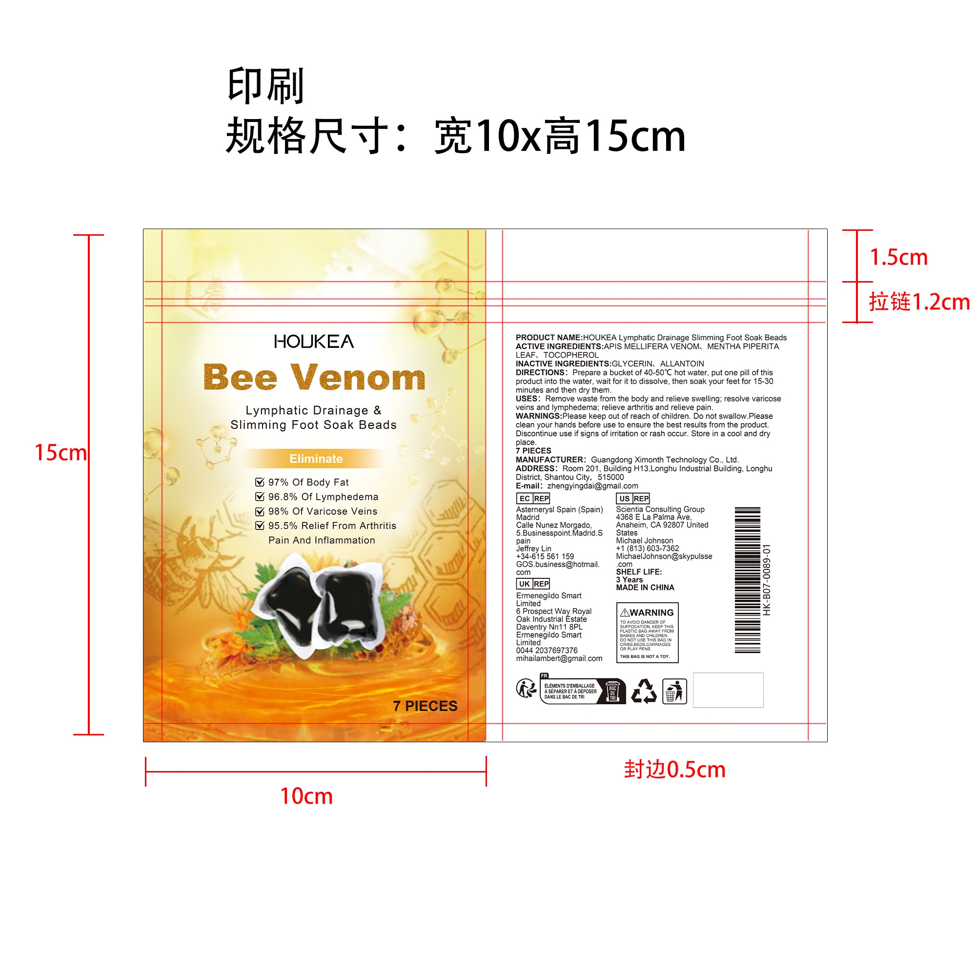 Product description: HOUKEA Lymphatic Drainage Slimming Foot Soak Beads. This product contains active ingredients such as APIS MELLIFERA VENOM and MENTHA PIPERITA leaf extract. The beads dissolve in hot water, providing benefits like removing waste from the body, reducing swelling, treating varicose veins and lymphedema, as well as relieving arthritis and pain. It is advised to soak feet in the solution for 15-30 minutes. Instructions recommend keeping the product out of reach of children, avoiding swallowing, and discontinuing use if signs of irritation occur. The manufacturer is Guangdong Ximonth Technology Co., Ltd., with contact details provided. Made in China, this product has a shelf life of 3 years.*