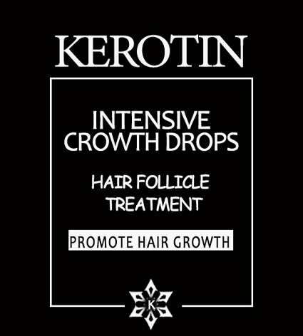 This text appears to be a label for a hair growth treatment product called "KEROTIN Growth Drops". It likely promotes hair growth by providing treatment to the hair follicles. The product seems to be focused on improving the health and growth of hair.*