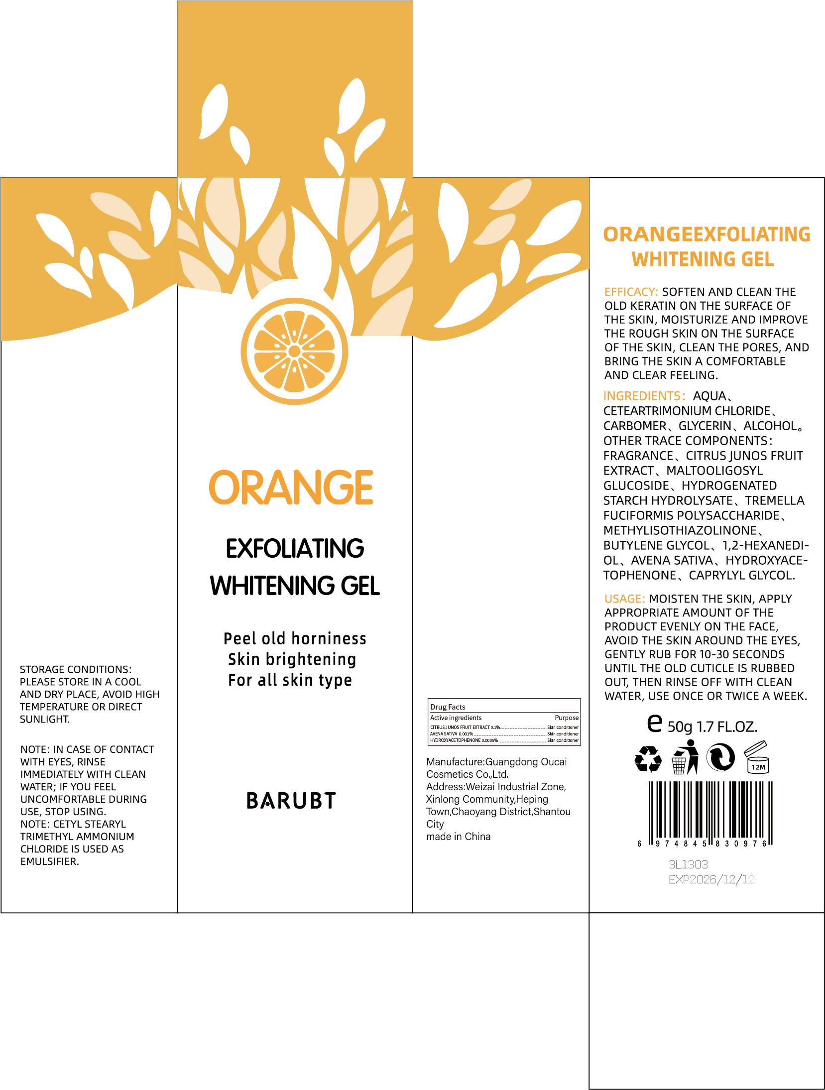 The following image provide visual information about the product associated with Barubt Orange Exfoliating Whitening Gel NDC 84712-020 by Guangdong Youbaijia Cosmetic Industry Co., Ltd, such as packaging, labeling, and the appearance of the drug itself. This resource could be helpful for medical professionals, pharmacists, and patients seeking to verify medication information and ensure they have the correct product.