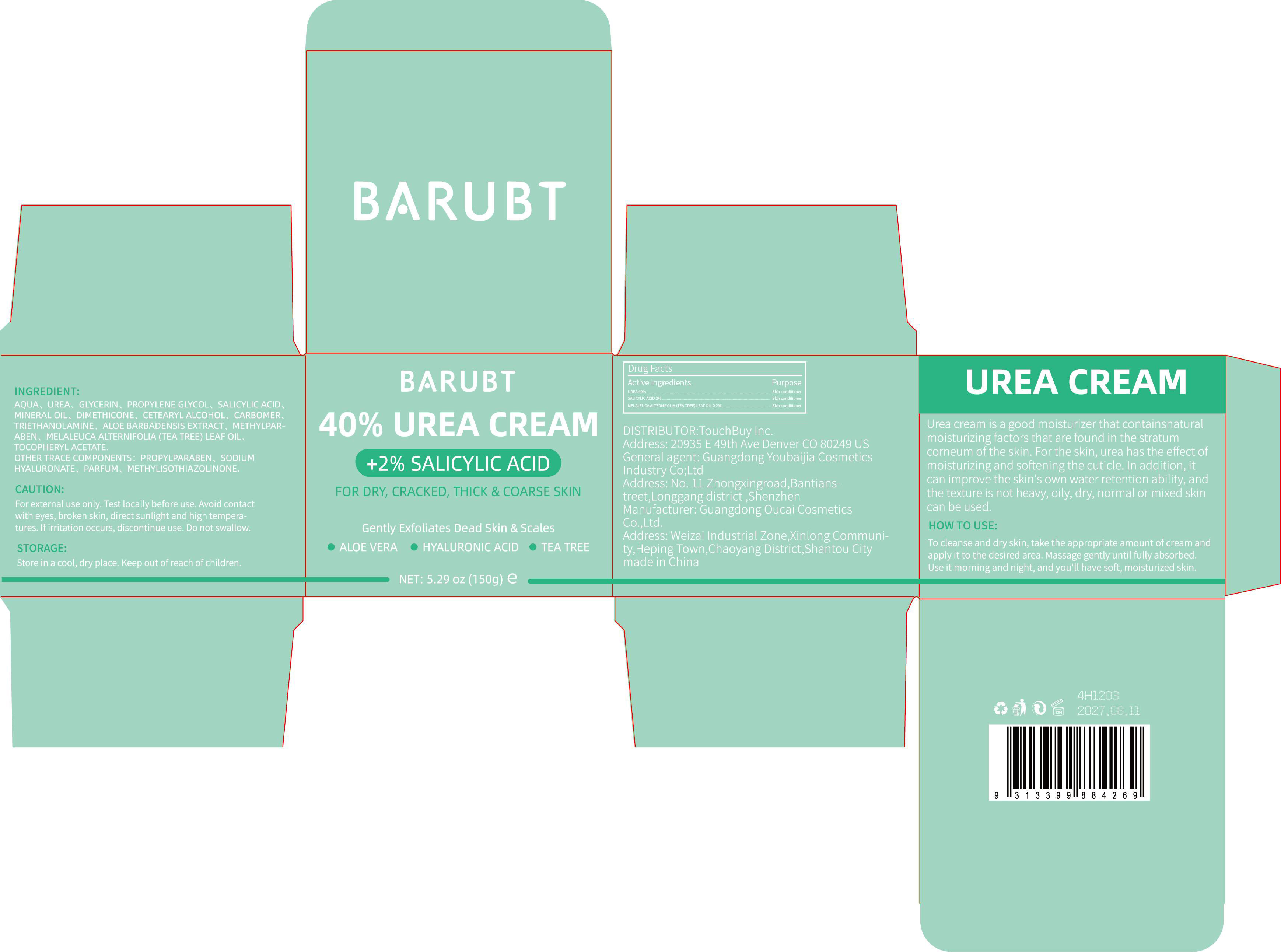 This is a detailed product description of a Urea Cream containing natural moisturizing factors. The cream contains 40% urea and 2% salicylic acid, along with other ingredients like glycerin, propylene glycol, and tea tree leaf oil. It is designed to moisturize and soften the skin, improve water retention, and suitable for all skin types. The instructions recommend applying the cream to cleansed and dry skin, massaging gently until fully absorbed. The product is distributed by TouchBuy Inc. with manufacturing details provided.*