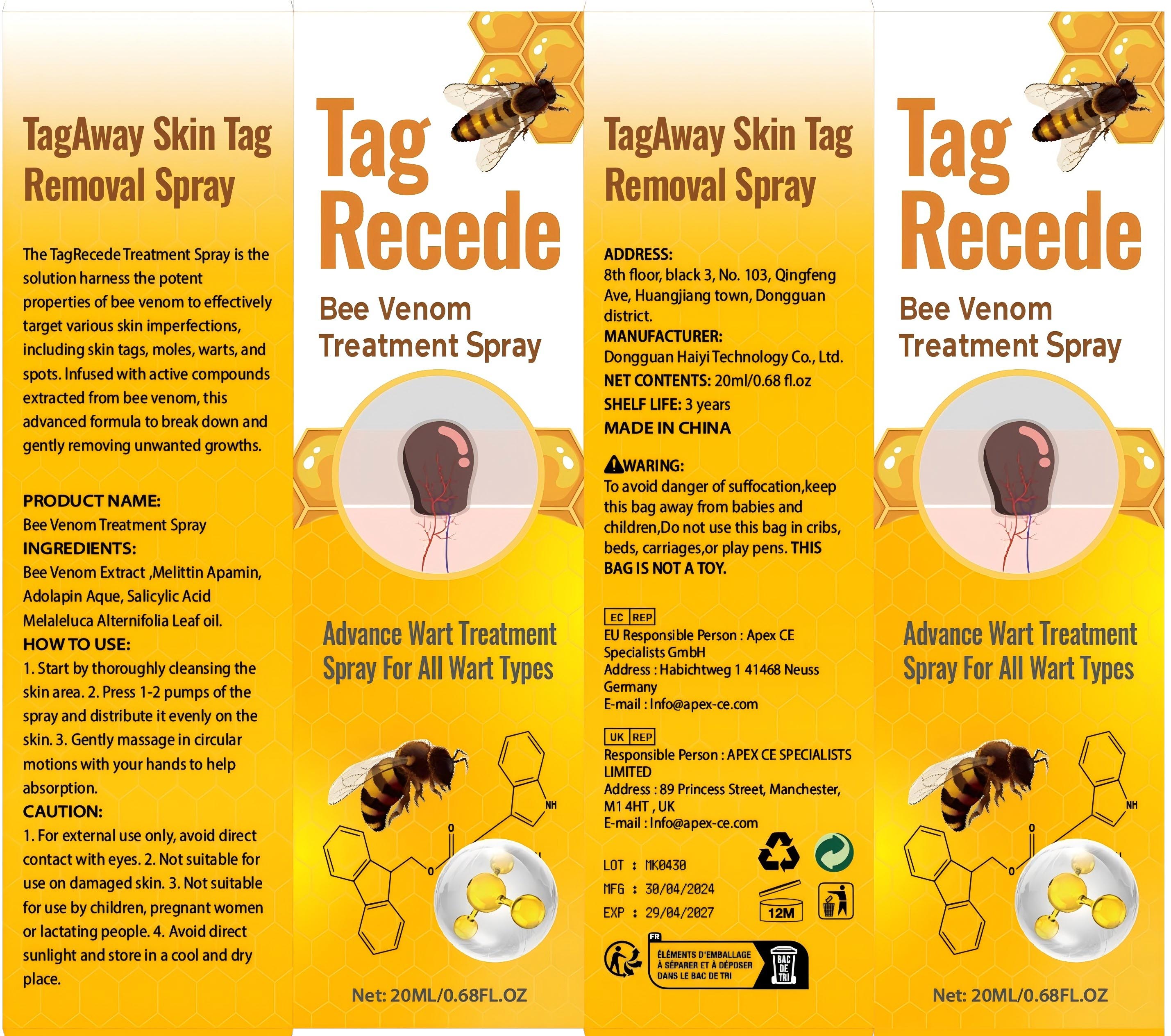 This text describes a skincare product called TagRecede Treatment Spray that harnesses the powerful properties of bee venom to target various skin imperfections such as skin tags, moles, warts, and spots. The advanced formula is designed to break down and gently remove unwanted growths. The manufacturer is Dongguan Haiyi Technology Co., Ltd., based in China, and the spray contains active compounds extracted from bee venom. The text also provides instructions on how to use the spray, cautionary advice, and contact information for the manufacturer.*
