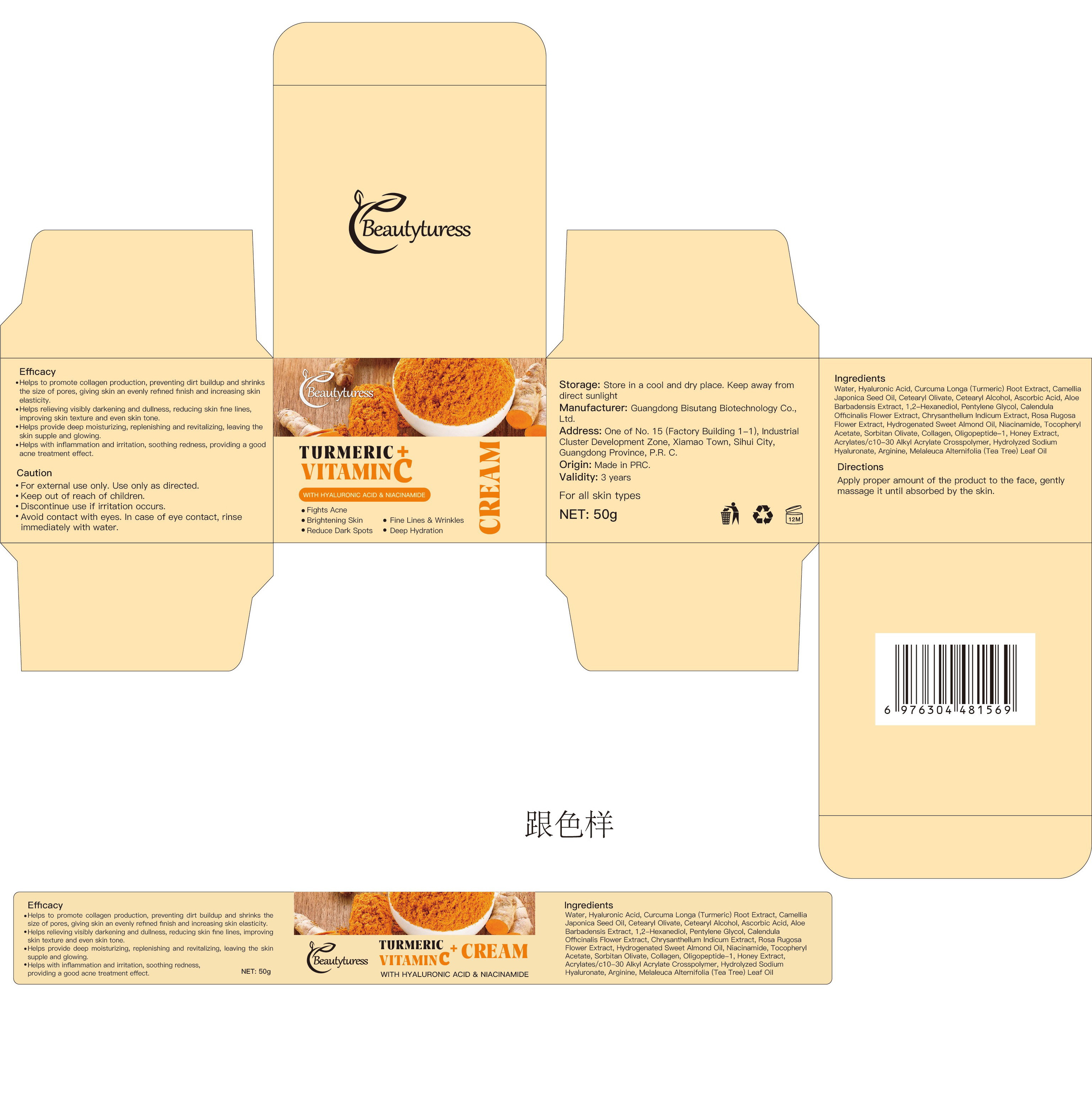 The following image provide visual information about the product associated with Beautyturess Turmeric Face Cream NDC 84753-003 by Guangdong Bisutang Biotechnology Co., Ltd., such as packaging, labeling, and the appearance of the drug itself. This resource could be helpful for medical professionals, pharmacists, and patients seeking to verify medication information and ensure they have the correct product.