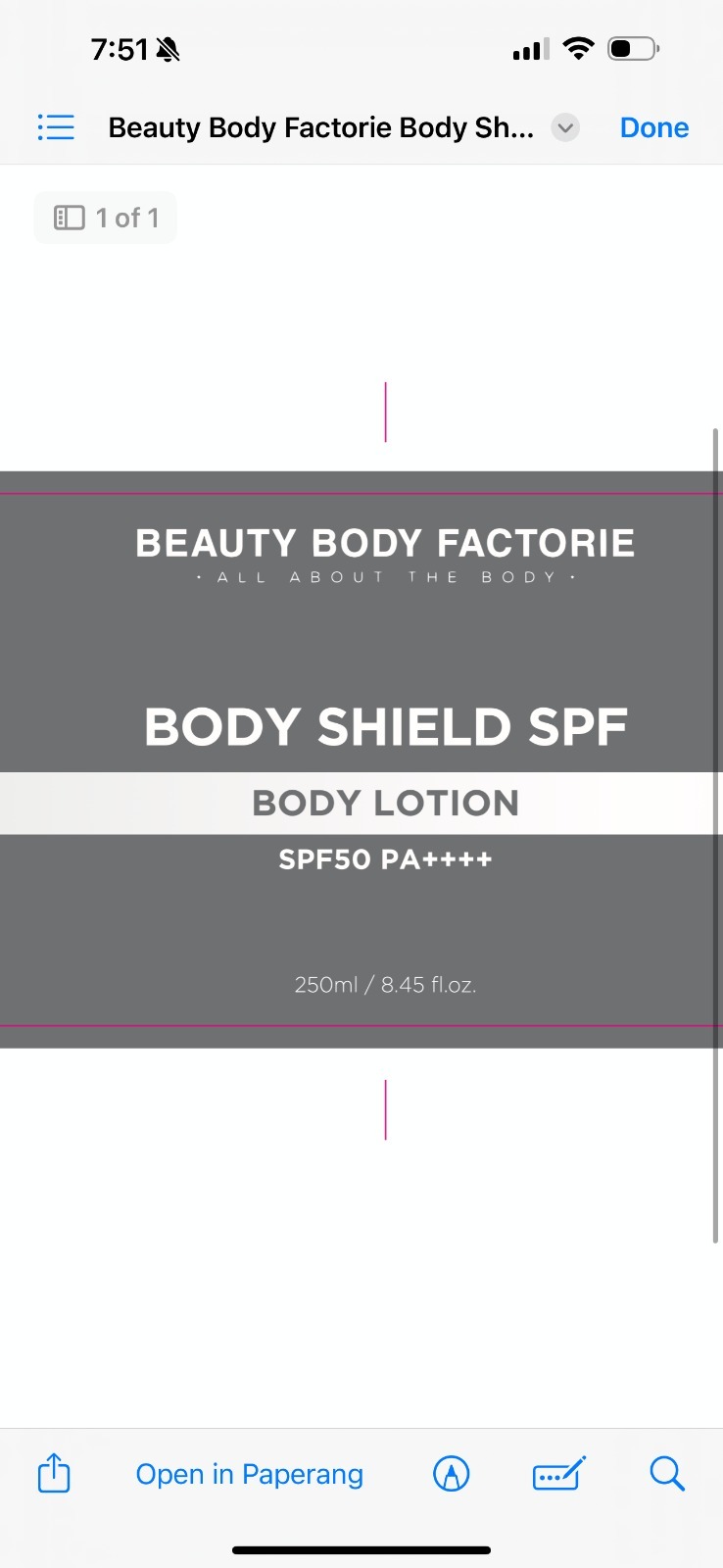 This text provides information about a Beauty Body Factorie Body Shield SPF50 PA++++ lotion in a 250ml (8.45 fl.oz.) bottle. The product seems to focus on providing sun protection and hydration for the body. It is suggested for use as a shield against harmful UV rays.*