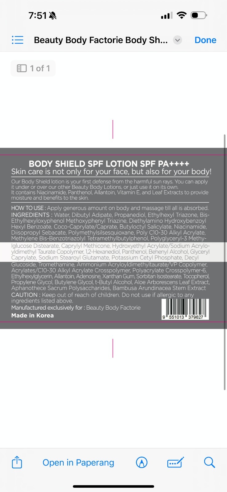 This is a description of a skincare product called "BODY SHIELD SPF LOTION SPF PA++++" by Beauty Body Factorie. The product is a body lotion with sun protection factor. The text mentions that skincare is not only important for the face but also for the body. It provides instructions on how to use the product and lists ingredients. Overall, it emphasizes the importance of protecting the skin from the sun while maintaining its condition.*