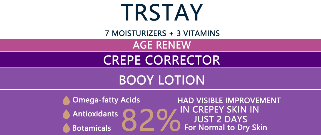 This text mentions a skincare product called TRSTAY. It contains 7 moisturizers and 3 vitamins for age renewal and crepe correction. The product promises visible improvement in crepey skin in just 2 days. It is suitable for normal to dry skin and includes antioxidants.*