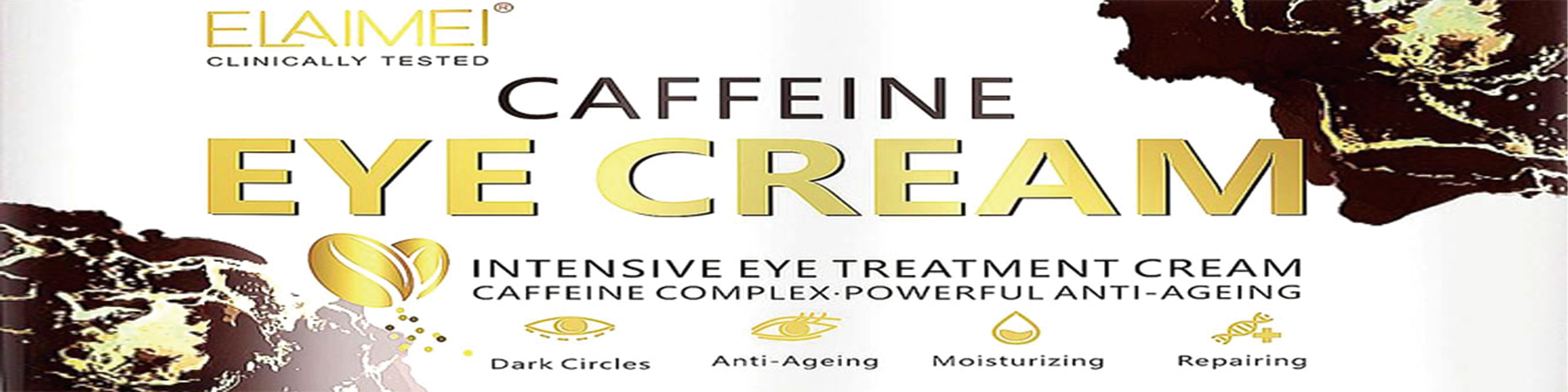 This text appears to be about a clinically tested eye treatment cream that contains caffeine complex. It claims to be powerful against dark circles and provides anti-aging, moisturizing, and repairing effects.*