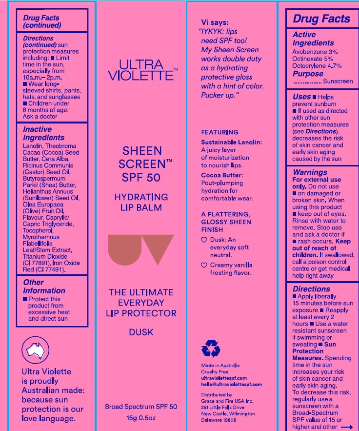 This is a description of a hydrating lip balm named "DUSK ULTRA VIOLETTE SHEEN SCREEN™ SPF 50". The product contains active ingredients like Avobenzone, Octinoxate, and Octocrylene to provide sun protection. It helps prevent sunburn and decreases the risk of skin cancer and premature skin aging. The lip balm is intended for external use and includes ingredients like Lanolin, Cocoa Seed Butter, and Shea Butter for moisturization. The user should apply liberally before sun exposure and reapply every two hours for effective sun protection. Additionally, it is advised to limit sun exposure, especially between 10 am and 2 pm, and wear protective clothing and sunglasses. The product is distributed by Grace and Fire USA Inc. and proudly made in Australia, focusing on sun protection as a vital aspect of skincare.*