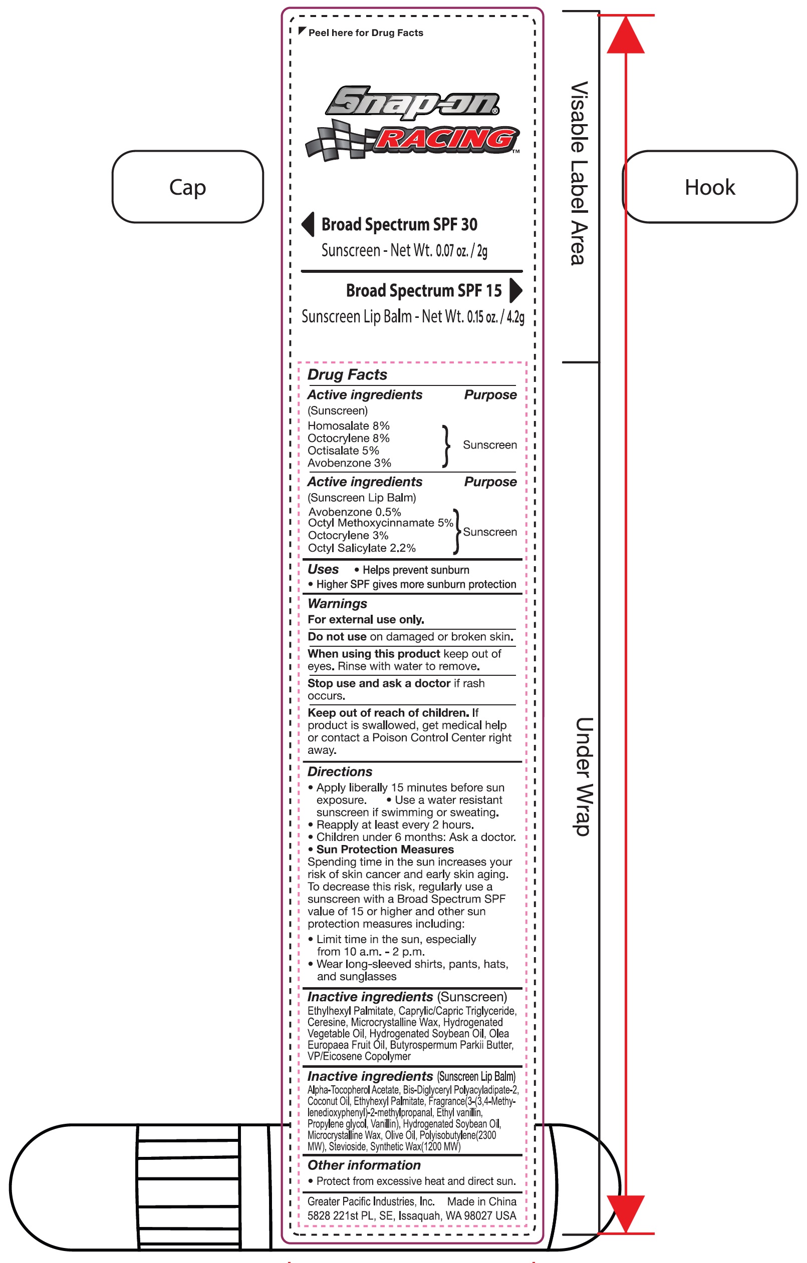 The following image provide visual information about the product associated with Snap On Racing Sunscreen Kit NDC 85204-000 by Greater Pacific Industries, Inc., such as packaging, labeling, and the appearance of the drug itself. This resource could be helpful for medical professionals, pharmacists, and patients seeking to verify medication information and ensure they have the correct product.