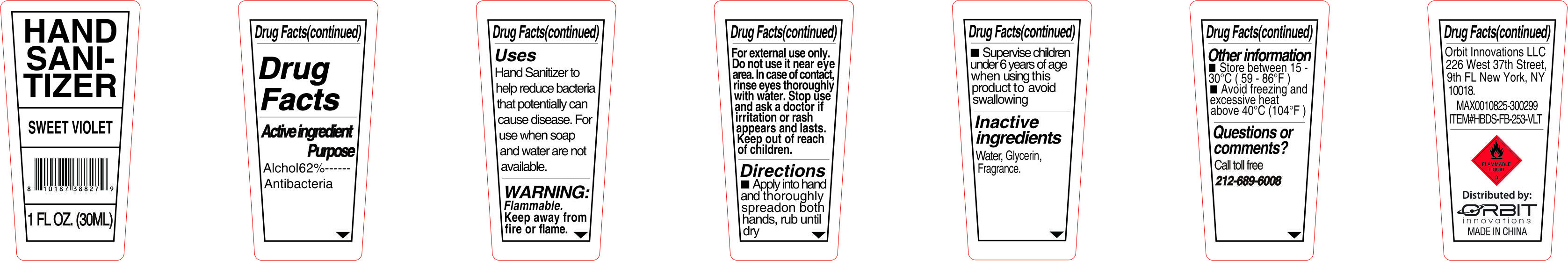 This is a label for Sweet Violet scented hand sanitizer in a 1 fluid ounce container. It contains 62% alcohol and is intended to reduce bacteria when soap and water are not available. The product is flammable and should be kept away from fire or flame. It is for external use only and should not be used near the eye area. In case of contact with eyes, rinse thoroughly with water. If irritation or rash occurs, stop use and consult a doctor. The hand sanitizer contains water, glycerin, and fragrance as inactive ingredients. It should be stored between 15-30°C (59-86°F) to avoid freezing or exposure to excessive heat. The product is distributed by Orbit Innovations LLC in New York and made in China. Contact customer service at 212-689-6008 for questions or comments.*
