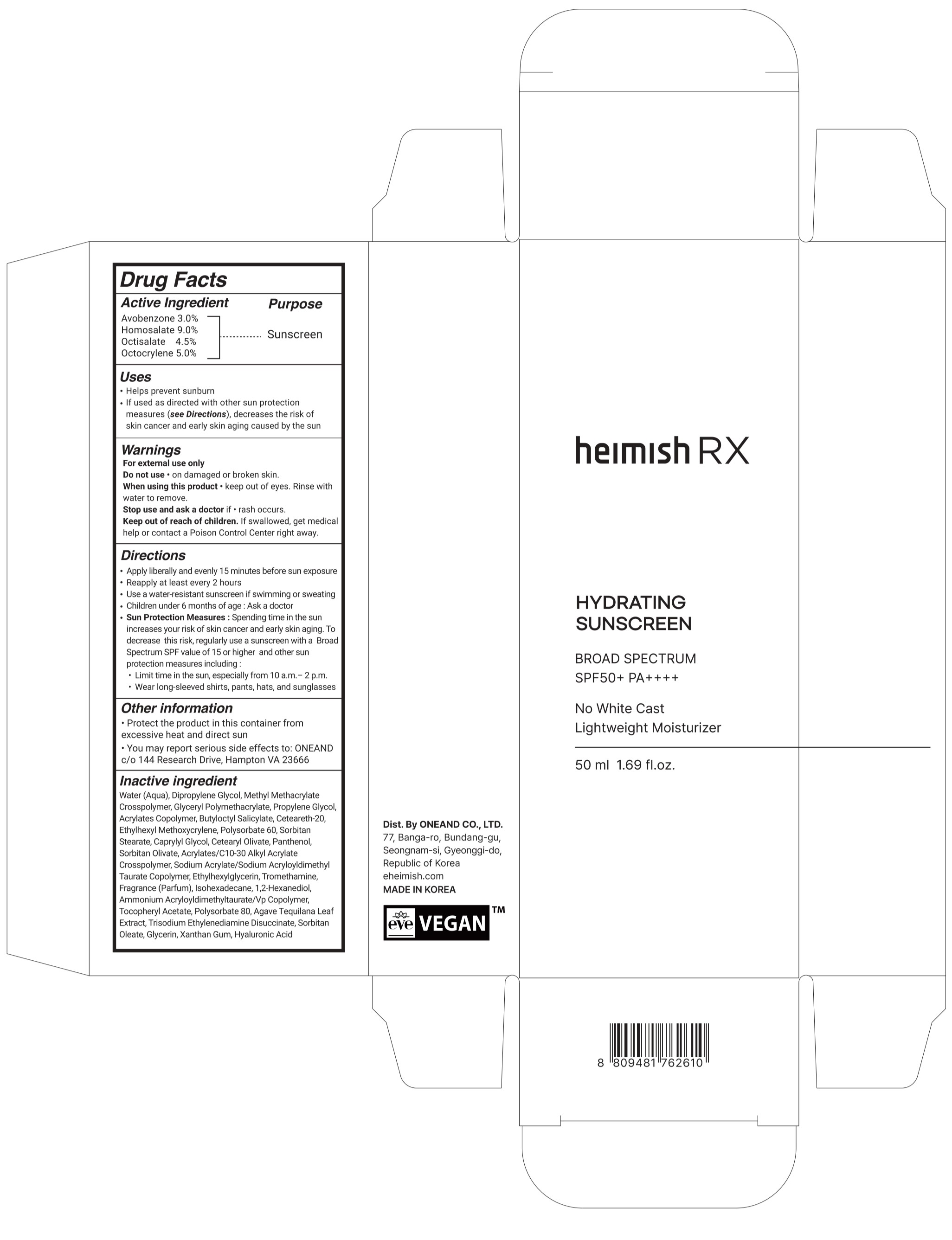 This is a drug facts label providing information about a sunscreen product. The active ingredients include Avobenzone, Homosalate, Octisalate, and Octocrylene. It helps prevent sunburn and decreases the risk of skin cancer and early skin aging when used alongside other sun protection measures. The product should be applied 15 minutes before sun exposure and reapplied every 2 hours. It is water-resistant for swimming or sweating. The sunscreen should be kept out of eyes and away from children. The label also lists inactive ingredients and provides contact information for reporting side effects. This sunscreen is distributed by ONEAND CO., LTD. from Korea. It is labeled as Heimish RX Hydrating Sunscreen, with a Broad Spectrum SPF50+ PA++++, and is a lightweight moisturizer without a white cast.*