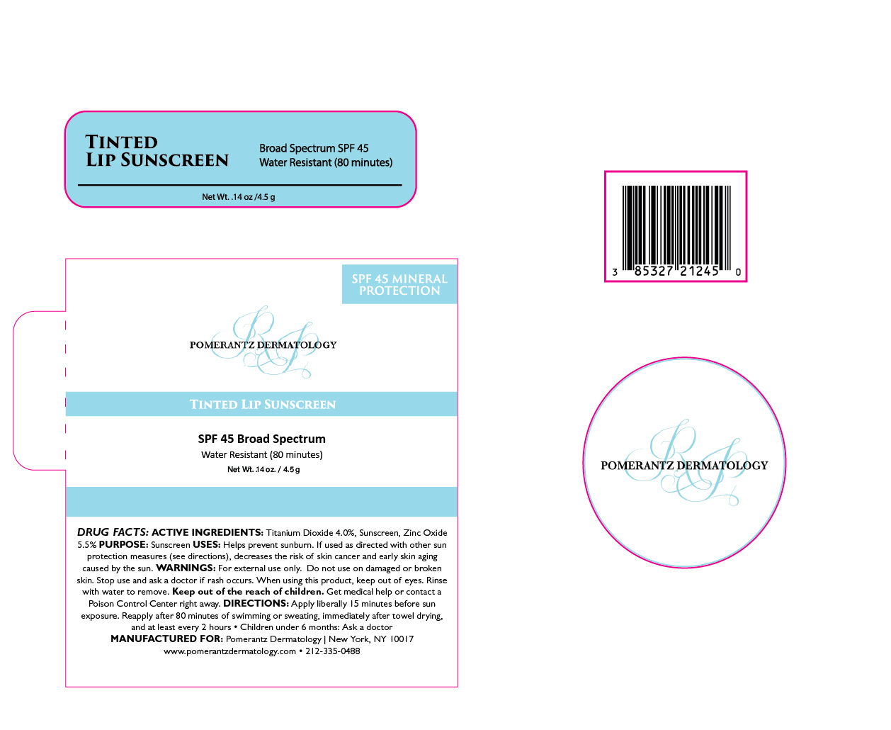 This is a description of a tinted lip sunscreen with SPF 45 from Pomerantz Dermatology. It is water-resistant for 80 minutes and contains active ingredients such as Titanium Dioxide and Zinc Oxide. The product is designed to help prevent sunburn and reduce the risk of skin cancer and premature aging. It should be applied liberally 15 minutes before sun exposure and reapplied every 2 hours or after swimming/sweating. The product is recommended for external use only and should not be applied on damaged skin. In case of rash or eye contact, immediate medical assistance is advised. Children under 6 months should consult a doctor before use. Manufactured for Pomerantz Dermatology in New York.*