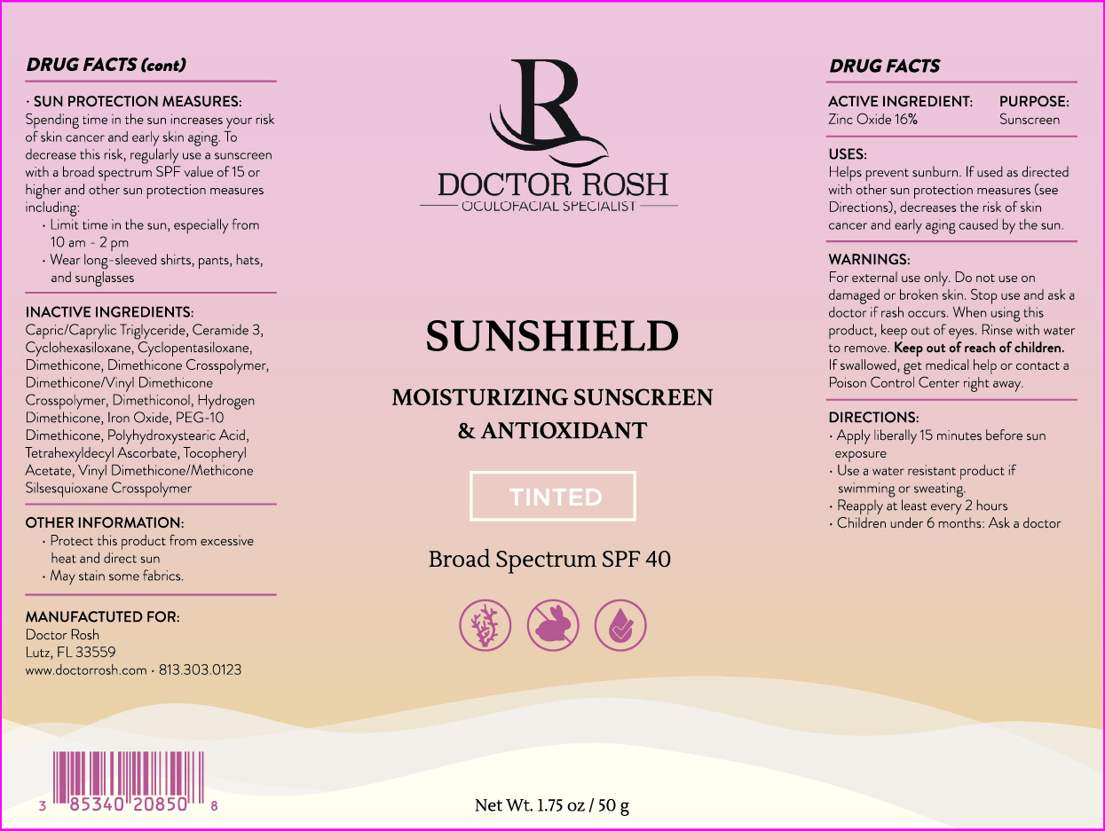 This is a sunscreen product information sheet that includes details on the active and inactive ingredients, sun protection measures, manufacturer information, directions for use, and warnings. It provides information on how to best protect your skin from the sun, prevent sunburn, and reduce the risk of skin cancer and early aging. The product is a Broad Spectrum SPF 40 Moisturizing Sunscreen & Antioxidant manufactured for Doctor Rosh. It contains Zinc Oxide (16%) as the active ingredient along with other ingredients listed as inactive. It also includes instructions on how to apply the sunscreen, when to reapply, and warnings about potential hazards like not using on damaged skin and avoiding contact with eyes.*
