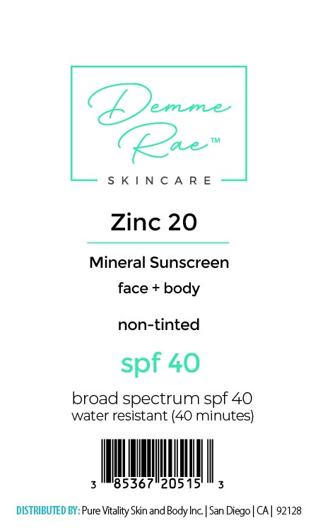 This text is a skincare product description for a Zinc 20 Mineral Sunscreen suitable for the face and body. It offers non-tinted sun protection with SPF 40 for broad-spectrum coverage. Additionally, the sunscreen is water-resistant for up to 40 minutes. The product is distributed by Pure Vitality Skin and Body Inc. located in San Diego, CA 92128.*