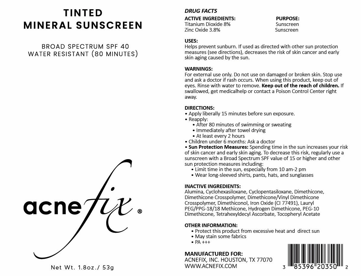 This is a description for a tinted mineral sunscreen with broad spectrum SPF 40 and water resistance for up to 80 minutes. It contains active ingredients like Titanium Dioxide and Zinc Oxide to prevent sunburn and skin damage caused by the sun. The directions include applying liberally before sun exposure, reapplying after swimming or sweating, and every 2 hours. It also provides information on sun protection measures and lists inactive ingredients like Alumina and Dimethicone. The product is manufactured for Acnefix, Inc. in Houston, TX.*