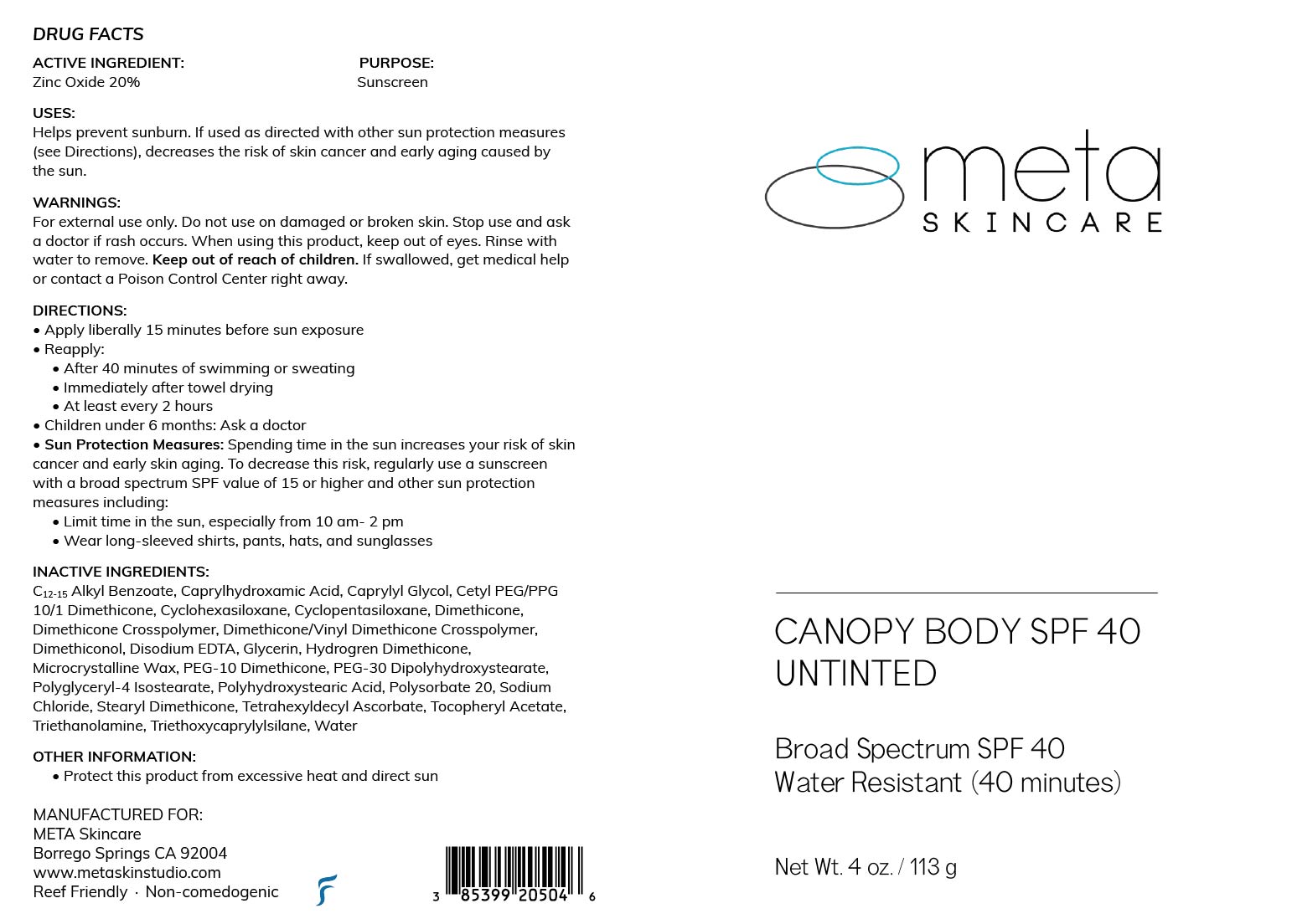 This is a detailed drug facts label for a sunscreen product provided by META Skincare. The sunscreen contains Zinc Oxide (20%) as the active ingredient, offering protection against sunburn and reducing the risk of skin cancer and early aging caused by the sun when used as directed. The product provides broad-spectrum SPF 40 protection, is water-resistant for 40 minutes, and is suitable for the body (untinted). It includes a list of inactive ingredients and usage directions such as applying liberally before sun exposure and reapplying after swimming or sweating. The label also includes warnings about external use only, avoiding contact with eyes, and seeking medical help if swallowed. Additionally, it suggests sun protection measures like limiting sun exposure, wearing protective clothing, and using sunglasses. The product is intended for external use and should be kept away from children and excessive heat.*